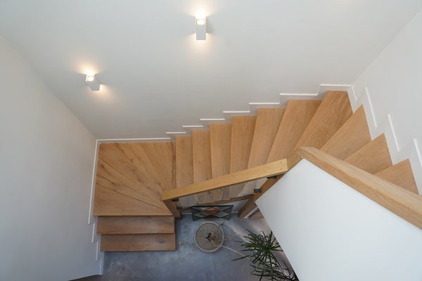 Het hart van het huis heeft een verrassender lichtinval via de slim geplaatste dakramen boven de werkelijk schitterende houten opgaande trap.
