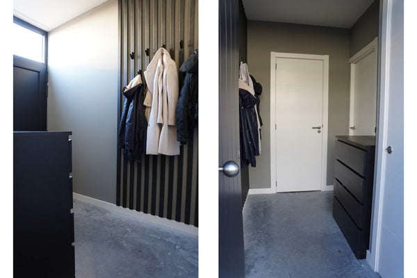 De hal, met meterkast, is strak en modern en geeft toegang tot het hangtoilet en de royale woonruimte.