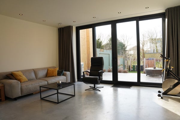 De uitbouw aan de achterzijde zorgt voor een heerlijke zithoek met dubbele schuifpuien naar de tuin.