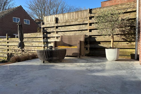 De achtertuin is verrassend en gelegen op het zuidwesten. Hier geniet je volop van de zon. Er zijn twee terrassen aangelegd, een praktische achterom en een nette hoek voor containers. Een fijne plek om buiten te leven, zonder veel onderhoud.