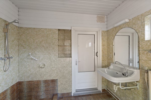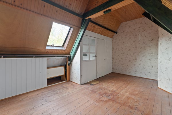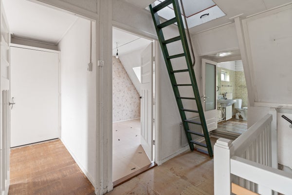 Indeling: hal, ruime woonkamer (circa 25 m2) met open haard, dichte keuken, toilet, en berging op de begane grond. Eerste verdieping met 3 slaapkamers (9, 9 en 8 m2) en badkamer met ligbad, douche, wc en wastafel. De tweede verdieping biedt een zolderruimte en slaapkamer, toegankelijk met een ladder. Achter de woning is een overkapping en bergruimte.