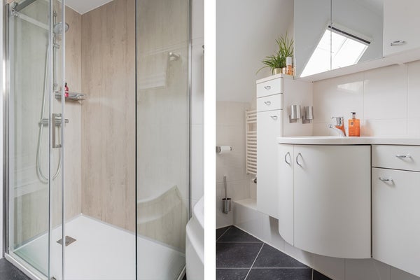 Vanaf de overloop zijn in totaal drie slaapkamers en de badkamer te bereiken. Bij de realisatie van de dakopbouw boven de garage is de indeling gewijzigd waardoor alle drie de kamers van ruim formaat zijn. De badkamer is netjes afgewerkt en beschikt over een wastafelmeubel, hangend closet, hoekbad en douche. De gehele verdieping is net als de begane grond modern afgewerkt.