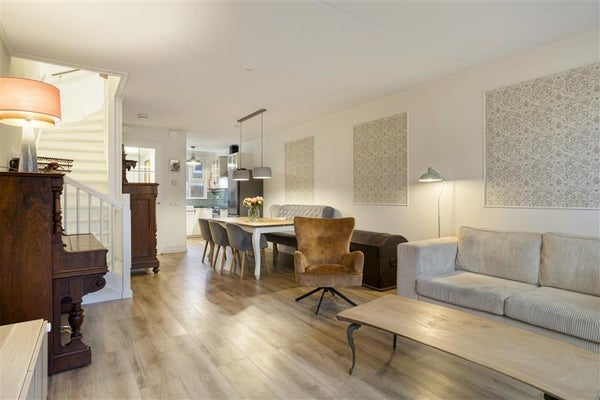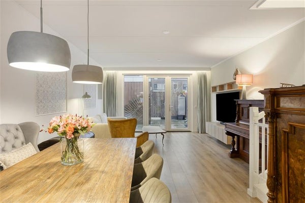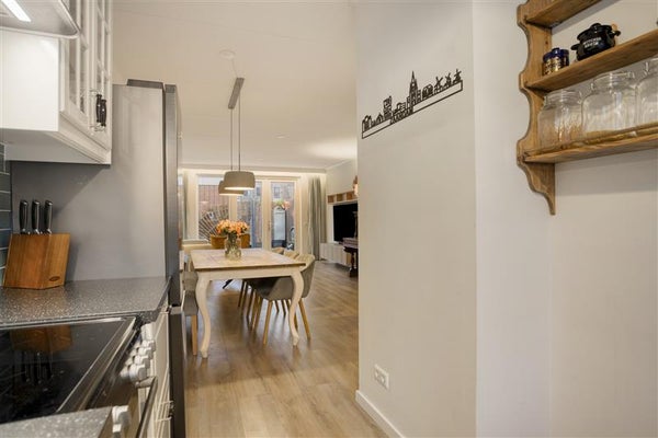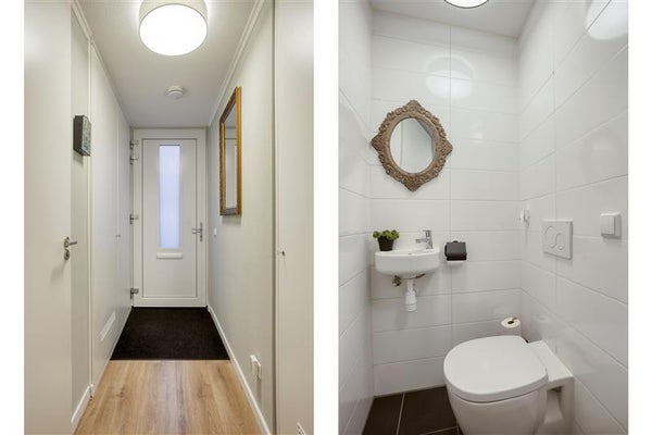 Stap binnen via de stijlvolle entree, waar een handige garderobe direct binnen handbereik is. Vanuit hier heb je toegang tot de gezellige woonkamer, compleet met openslaande tuindeuren die je laten genieten van een royale en zonnige tuin op het noordwesten. De woonkamer is afgewerkt met een strakke laminaatvloer en vloerverwarming voor dat extra gevoel van warmte en luxe. Tevens vind je beneden een toilet met fonteintje, een meterkast en een trapkast met daarin de wasmachineaansluiting.