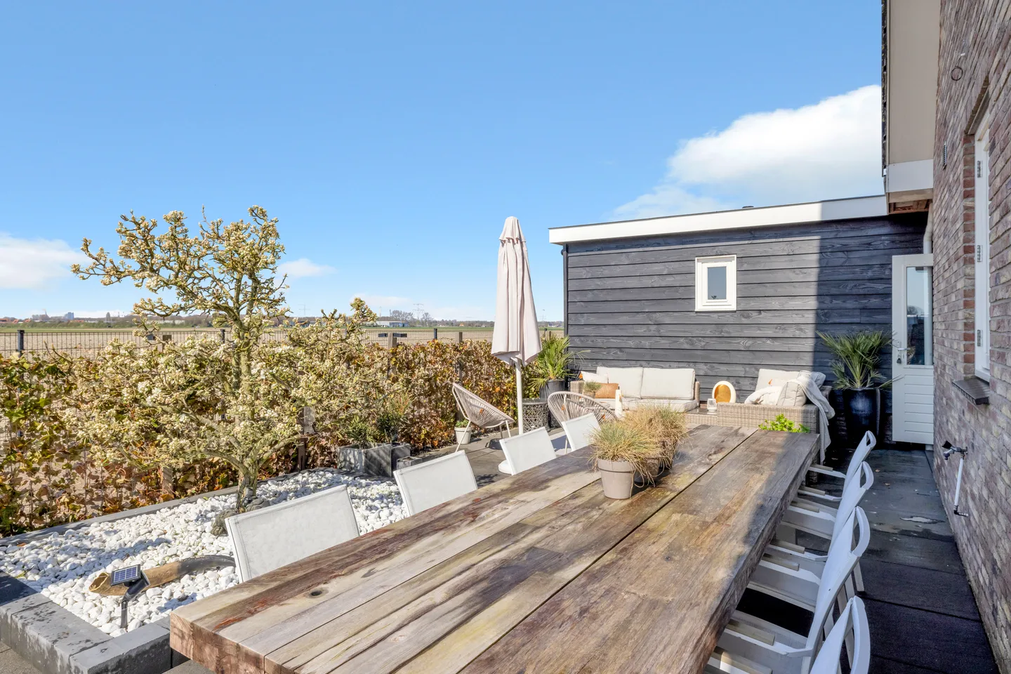 Leef 365 dagen per jaar met een vakantiegevoel in deze architectonisch ontworpen vrijstaande woning uit 2008. Geniet van het weidse uitzicht vanuit de ruime woonkamer, die aansluit op een luxe open keuken met een kookeiland en hoogwaardige apparatuur. De woning biedt vier slaapkamers, twee badkamers en een praktische wasruimte. Het perceel van 7.490 m2 bevat een vrijstaande BnB en wellnessruimte, compleet met sauna en jacuzzi, perfect voor privé of zakelijk gebruik. De tuin rondom biedt zowel zonnige als beschutte plekjes, met een eigen boomgaard en kas. Op fietsafstand van het centrum van Oostvoorne en omringd door natuur, vormt deze woning een ideale uitvalsbasis.