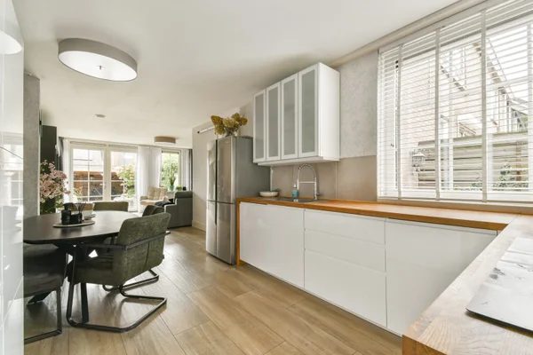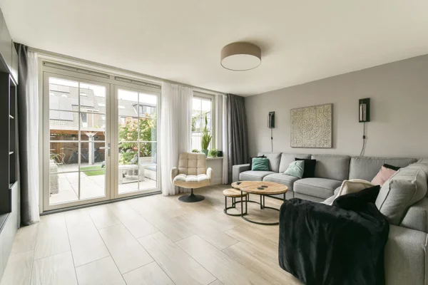 Bij binnenkomst vanuit de hal vind je een toilet en een lichte woonkamer met open keuken, die is uitgerust met moderne inbouwapparatuur. Grote ramen en openslaande deuren zorgen voor veel lichtinval en toegang tot de verzorgde achtertuin, ideaal om te ontspannen.