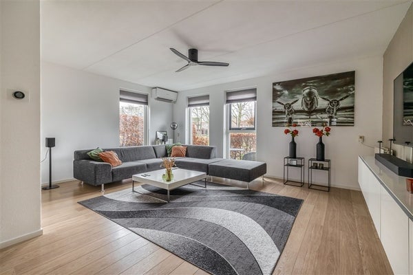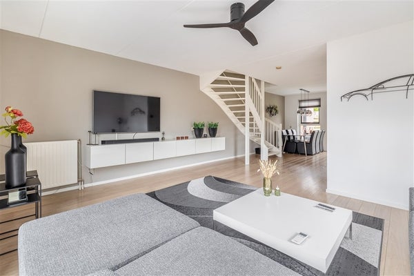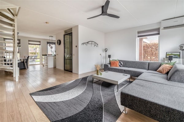 L-vormige woonkamer, 42 m², v.v. een laminaatvloer gestucte wanden, airco, veel raampartijen en een open trap.