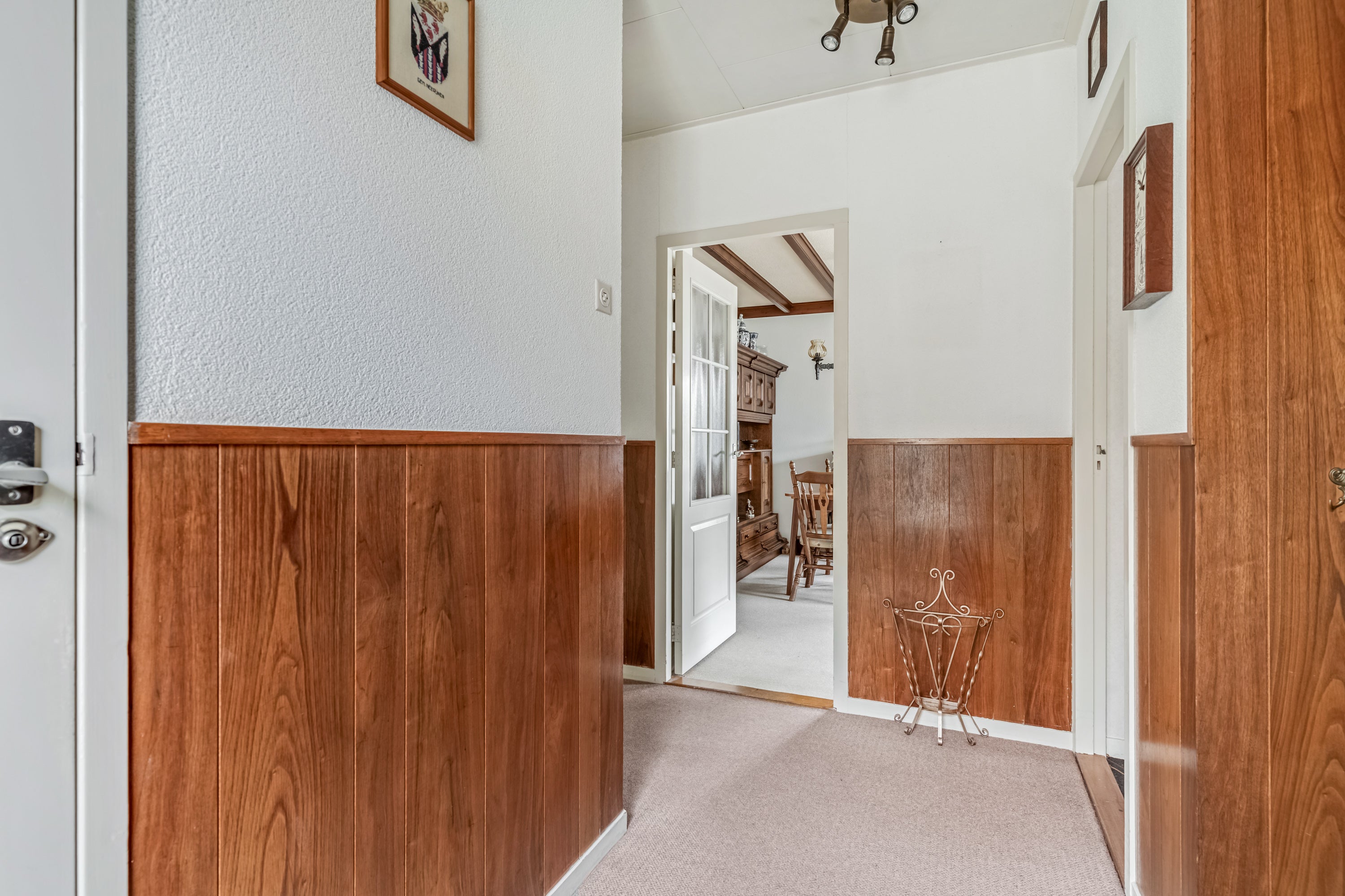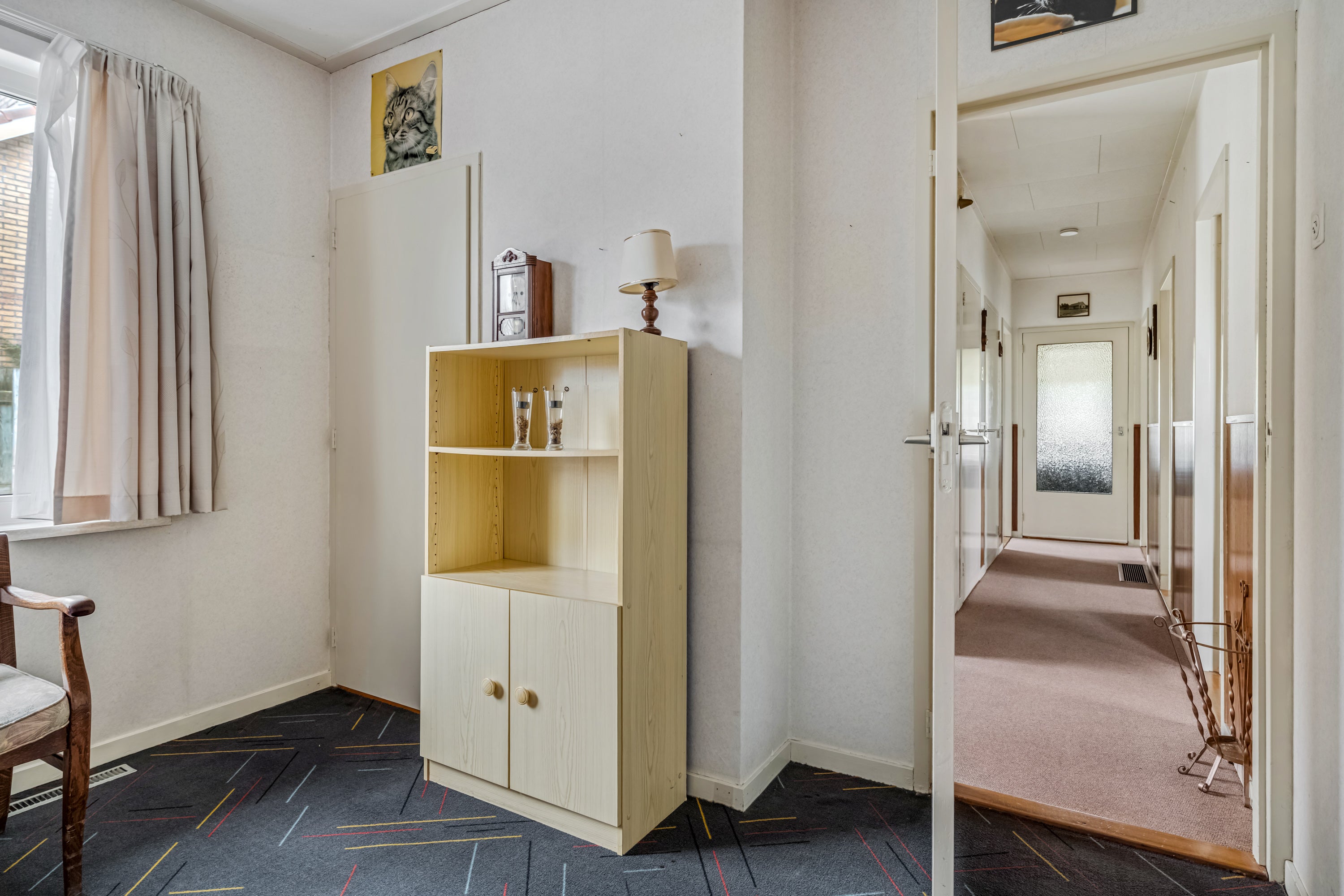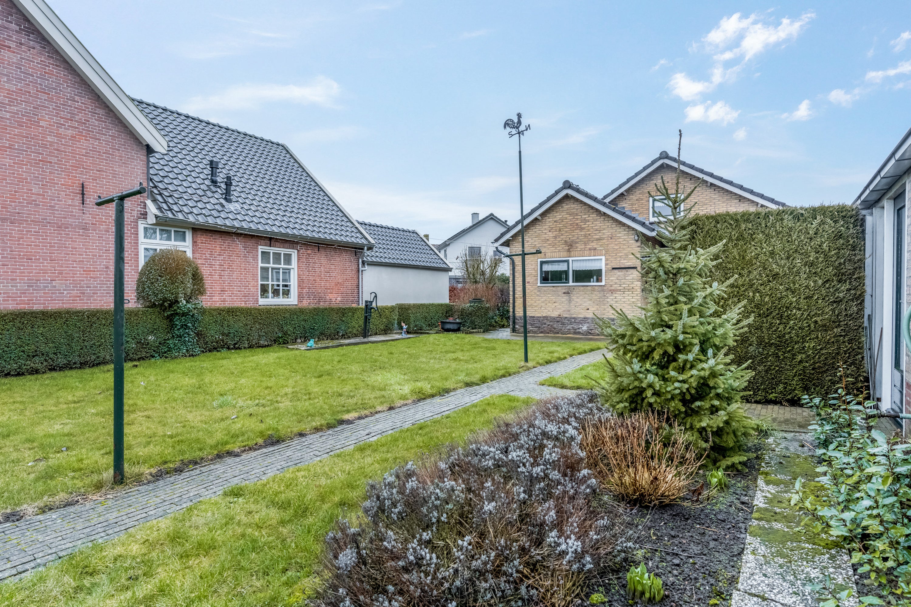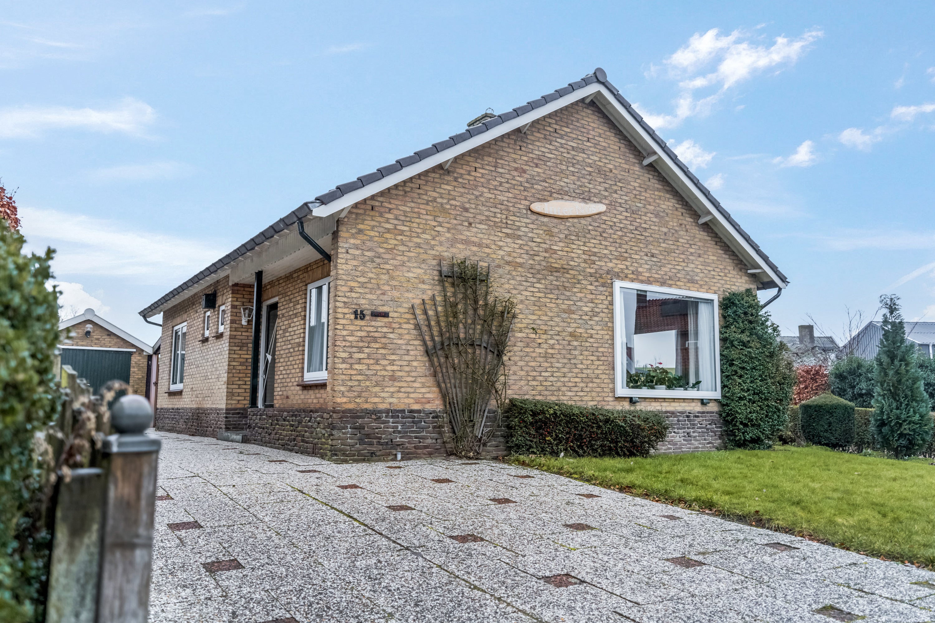De begane grond heeft een entree, hal met toilet, lichte woonkamer met gashaard, een dichte keuken en een badkamer met douche. Er zijn drie slaapkamers, waarvan twee met vaste kasten. Op de eerste verdieping bevinden zich nog eens twee slaapkamers met vaste kasten. Buiten is er een verlengde garage met berging en een tuin rondom, inclusief een voormalige moestuin.