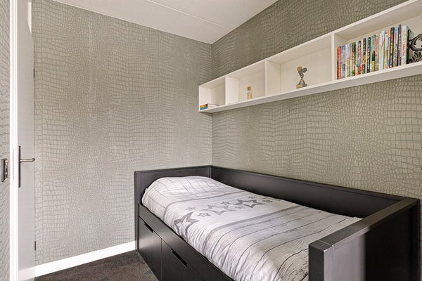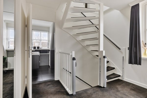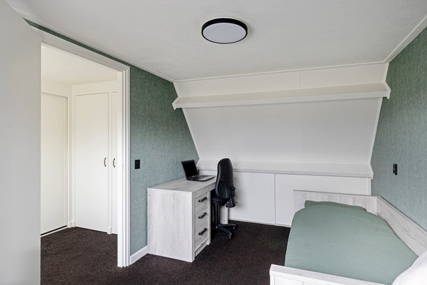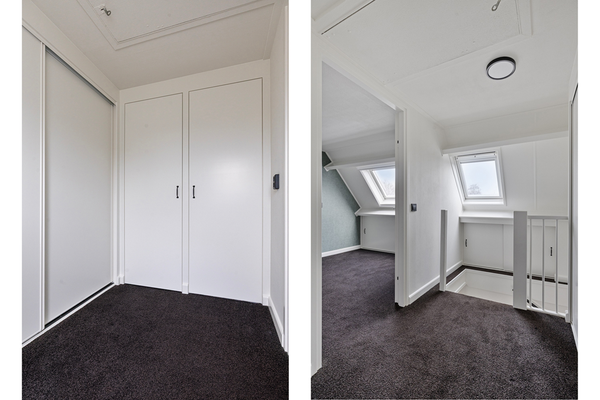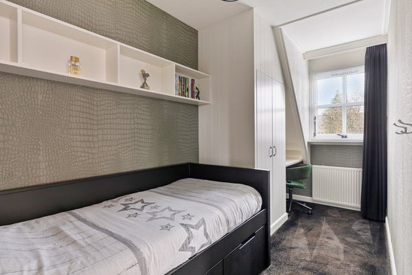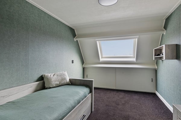 Op de tweede verdieping kom je op een overloop met dakraam en verrassend veel kastruimte, netjes weggewerkt in inbouwkasten. Hier hangt ook de CV-ketel (2022). De vierde slaapkamer is een fijne, lichte ruimte met een groot dakraam (voorzien van hor) en aan beide zijden bergruimte achter de knieschotten. Een volwaardige slaapkamer die voor meerdere doeleinden geschikt is. Via een vlizotrap bereik je vanaf de overloop de bergzolder.