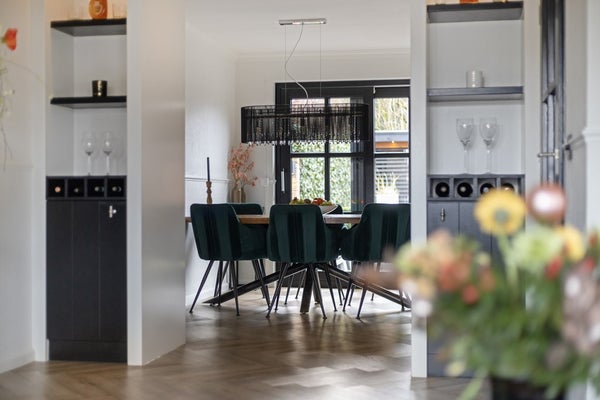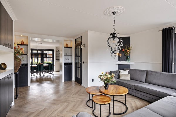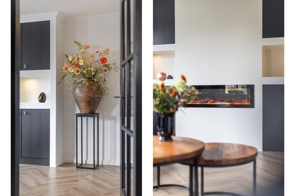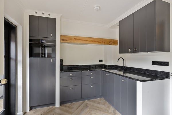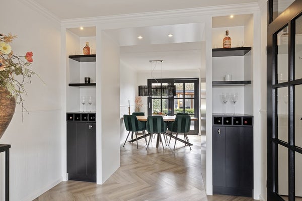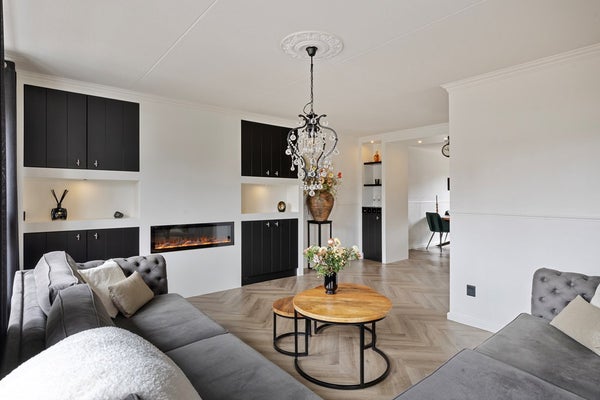 Je komt binnen in de nette hal met garderoberuimte en meterkast. Het zwevende toilet met fonteintje is modern afgewerkt. Vanuit de hal stap je de woonkamer in, waar direct de warme sfeer opvalt. De fraaie visgraad PVC-vloer met vloerverwarming loopt door over de hele begane grond. In de woonkamer vind je een stijlvol wandmeubel met elektrische sfeerhaard en spotjes: een echte blikvanger. Tussen de woonkamer en de eetkeuken is een slimme inbouwkast gerealiseerd die zorgt voor een mooie overgang tussen de ruimtes. Aan beide zijden zijn dubbele kasten aanwezig, dus volop bergruimte. De eetkeuken ligt aan de achterzijde en heeft een fijne plek bij de schuifpui (voorzien van hor) voor een grote eettafel. De strakke zwarte inbouwkeuken in hoekopstelling is compleet uitgerust met diverse inbouwapparatuur, waaronder een nieuwe warmwaterboiler en oven. Aansluitend vind je de praktische bijkeuken met inbouwkast en aansluitingen voor wasmachine en droger. Vanuit hier heb je toegang tot het terras én tot de inpandige garage. De garage is keurig afgewerkt en voorzien van een kastenwand, systeemplafond en uitstortgootsteen.