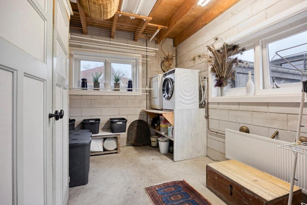 In de garage is een werkplaats, en een zeer ruim waslokaal met veel lichtinval en een extra toiletruimte. Deze ruimte(s) zouden ook bij het appartement erboven kunnen worden getrokken om het te vergroten.