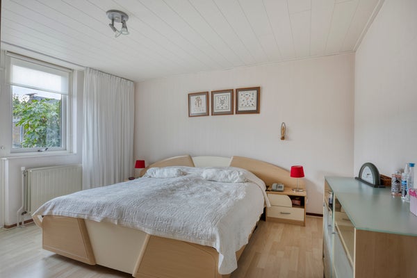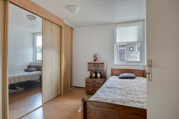 De bungalow telt drie slaapkamers, waarvan de hoofdslaapkamer ruim en licht is met een deur naar de tuin. De complete badkamer beschikt over een inloopdouche met wegklapbaar glazen douchescherm, wastafelmeubel, zwevend toilet en designradiator.