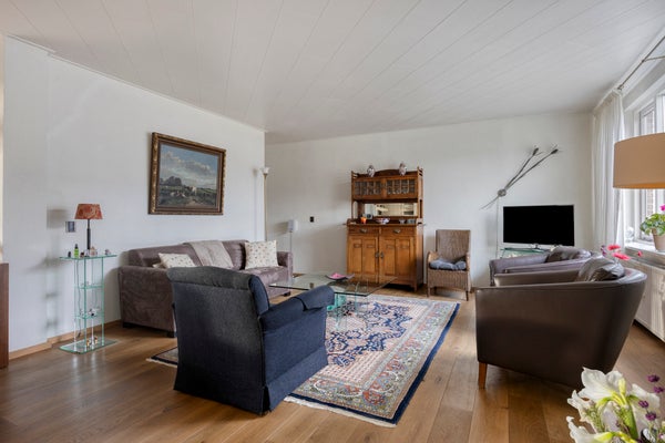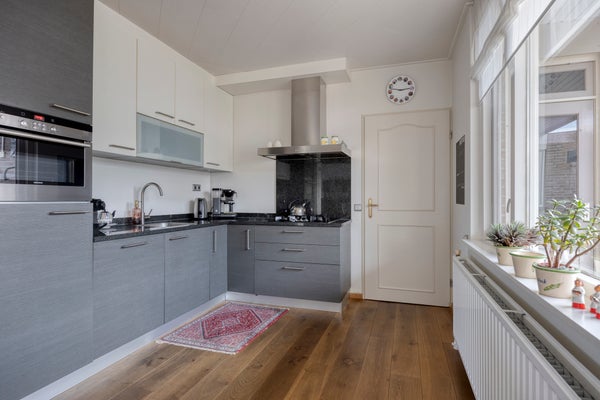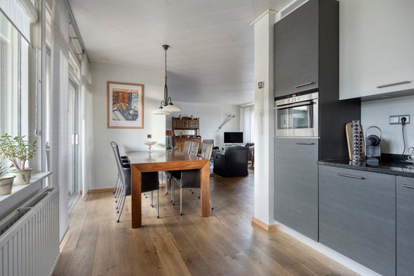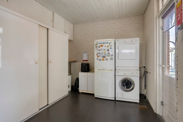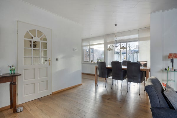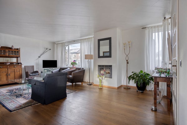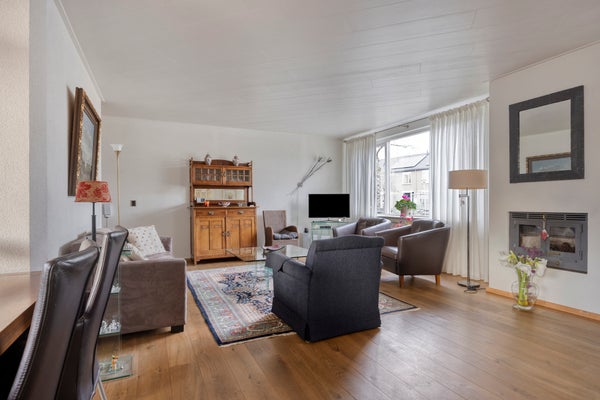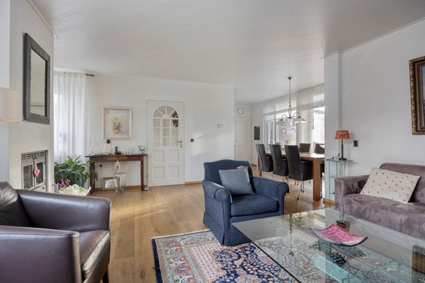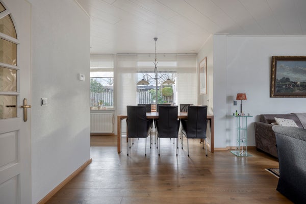 De instapklare woning beschikt over een ruime Z-vormige woonkamer met eikenhouten parketvloer, een gezellige houtkachel en een schuifpui naar de tuin, een luxe open keuken met inbouwapparatuur (2017), bijkeuken met witgoedaansluitingen en veel kastruimte en toegang tot de verwarmde garage.