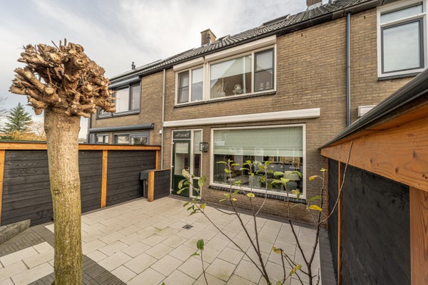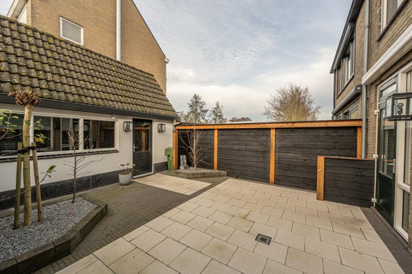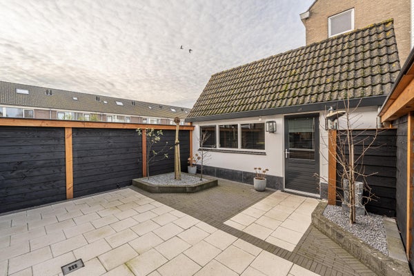 De verzorgde achtertuin, gelegen op het westen, is aangelegd met sierbestrating en gezellige fruitboompjes. Via de achterom is direct toegang tot de schuur, die is voorzien van een klein keukenblok en extra opbergruimte op de vliering. De schuur beschikt over een stenen bies, dubbel glas, een geïsoleerd dak en een mechanische installatie, waardoor deze ruimte ideaal is als hobbyruimte of praktische berging.