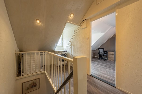De voorzolder is voorzien van een wasmachine- en drogeropstelling, een inbouwkast met cv-ketel en praktische opbergruimte achter de knieschotten. Daarnaast is er een vliering aanwezig voor extra bergruimte. Ook deze verdieping beschikt over airconditioning.