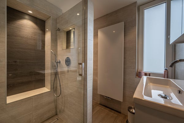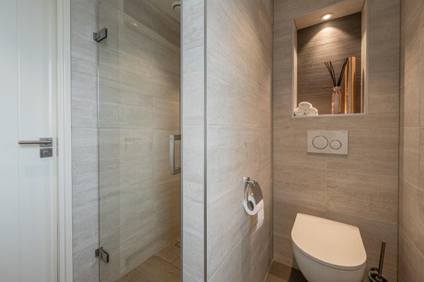 De moderne badkamer (2020) is stijlvol uitgevoerd in een warme beige kleurstelling en uitgerust met een inloopdouche met zitje, een hangtoilet en een wastafelmeubel. Vloerverwarming en dimbare spotjes maken deze badkamer compleet.
