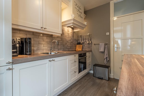 De keuken is praktisch en compleet ingericht met een 5-pits inductiekookplaat, afzuigkap, oven, koel-vriescombinatie en vaatwasser. De keukenkastjes zijn uitgevoerd in een crème kleurstelling en het kunststof werkblad maakt het geheel stijlvol af.