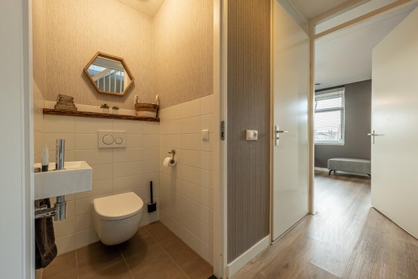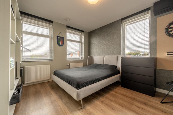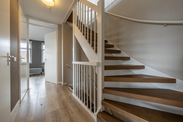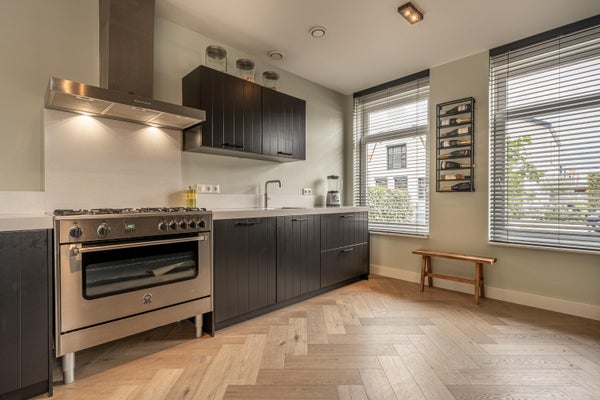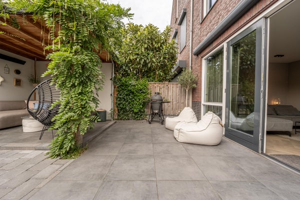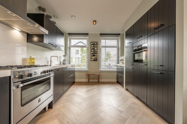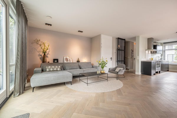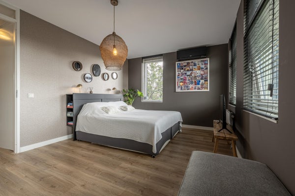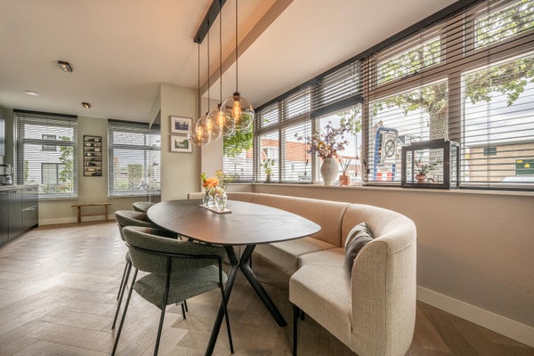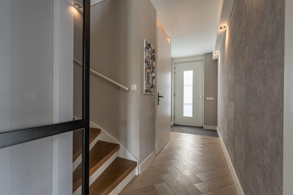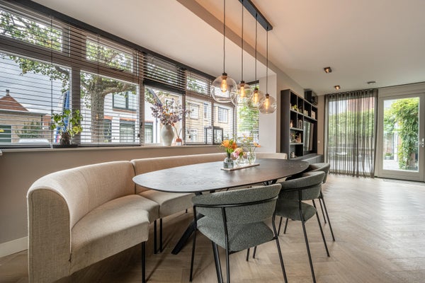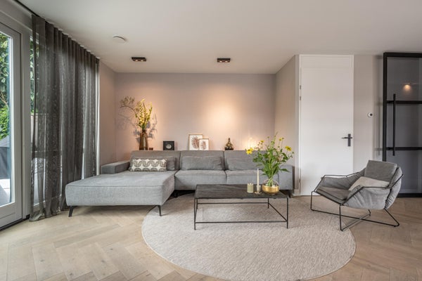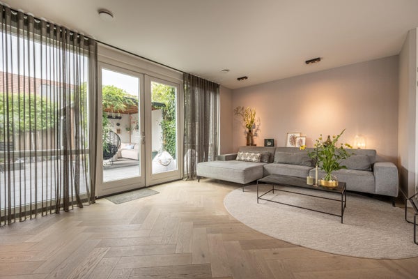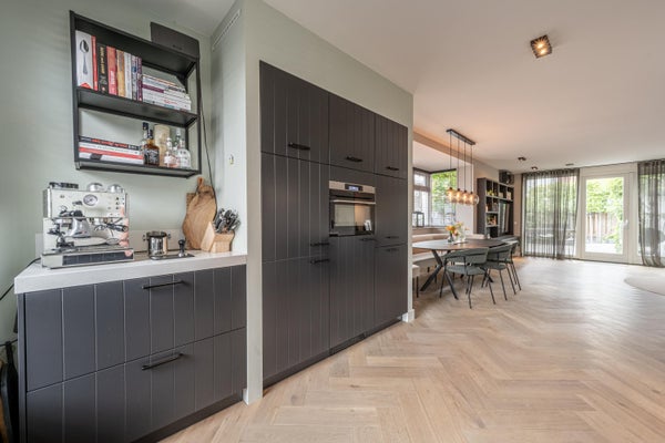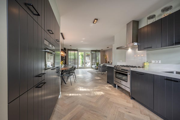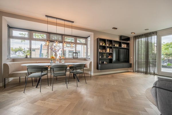 Vanuit de hal geeft een stijlvolle stalen deur toegang tot de royale woonkamer. Hier vind je een fijne en comfortabele zithoek en een gezellige eethoek. De woonkamer is afgewerkt met een prachtige houten visgraatvloer met vloerverwarming, sfeervolle inbouwspots en hoogwaardig afgewerkte zwarte design airconditioning. Daarnaast is er een praktische trapkast aanwezig. De openslaande deuren zorgen voor veel lichtinval en een directe verbinding met de zonnige tuin. De jaloezieën blijven achter, wat het geheel compleet maakt.