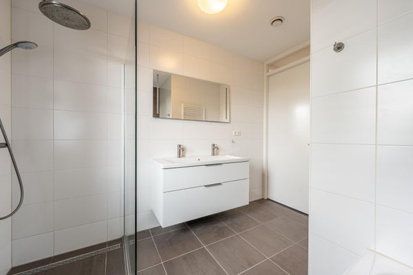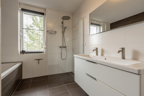 De moderne badkamer is volledig betegeld en heeft een tijdloze afwerking in wit en taupe. Met een inloopdouche met stortdouche, een ligbad en een dubbel wastafelmeubel is dit een fijne plek om te ontspannen. Een designradiator, vloerverwarming en mechanische ventilatie maken het geheel compleet.