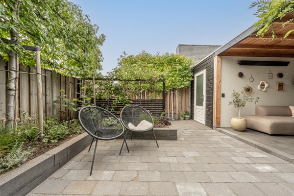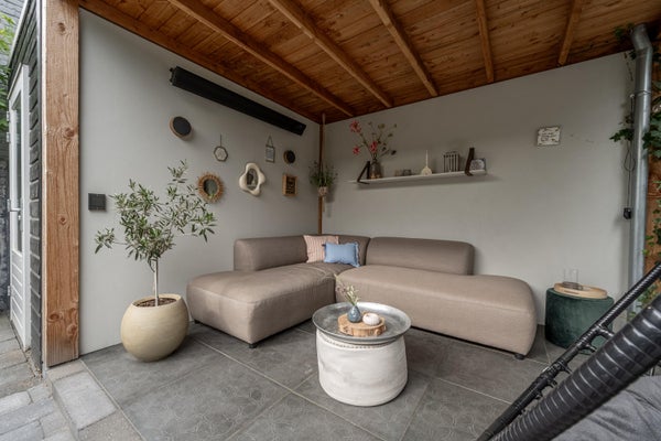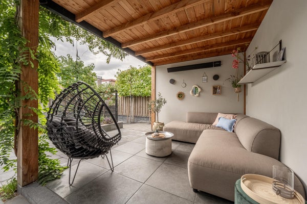 De achtertuin ligt op het zonnige zuiden en is sfeervol aangelegd met siertegels, groene borders en fruitbomen. Onder de mooie overkapping kun je heerlijk beschut genieten van het buitenleven. Verder is de tuin voorzien van een groot elektrisch zonnescherm, een buitenkraan, een houten berging met elektra en een praktische achterom.