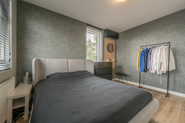 De overloop biedt toegang tot drie slaapkamers, een apart toilet en de badkamer. Zowel de overloop als de slaapkamers zijn afgewerkt met een fraaie pvc-vloer en alle kamers beschikken over rolluiken. Twee slaapkamers zijn uitgerust met zwarte design airconditioning, waardoor het er ook op warme dagen comfortabel is. De derde kamer is ingericht als handige kastenkamer, waarbij de vaste kasten achterblijven.