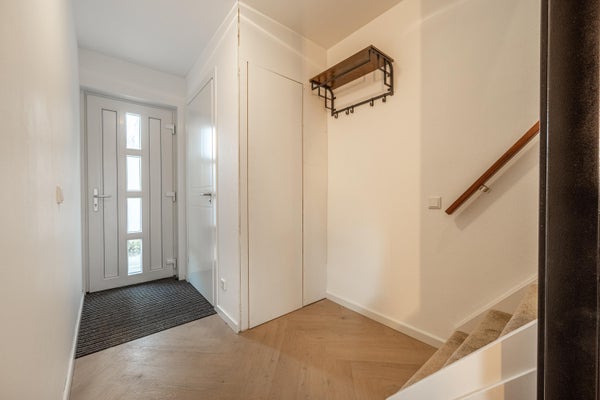 Entree van de woning met hal voorzien van een modern hangtoilet (2025) met mechanische ventilatie en een fonteintje, afgewerkt met witte wandtegels. In de hal bevindt zich tevens de nieuwe meterkast uit 2025, uitgerust met 3 fasen.