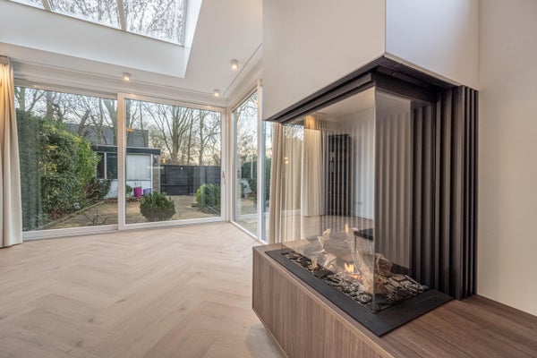 De in 2025 uitgebouwde en tuingerichte woonkamer met schuifpui is een fantastische leefruimte, met heerlijk lichtinval door de vele raampartijen en het dakraam. De gashaard zorgt voor sfeer en warmte op winterse avonden. De pvc vloer met vloerverwarming maken het geheel compleet samen met de praktische trapkast.