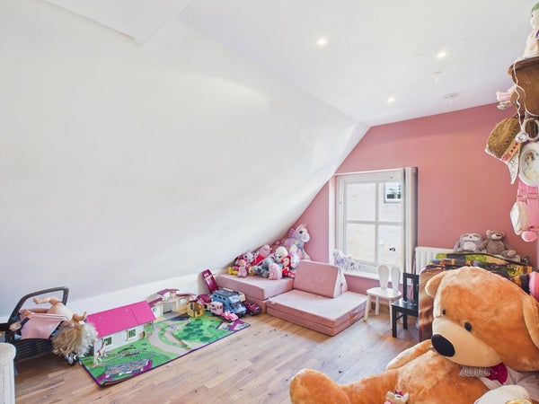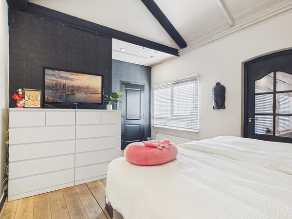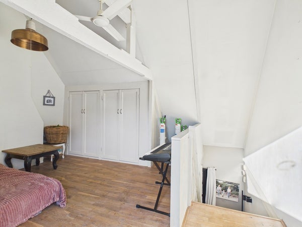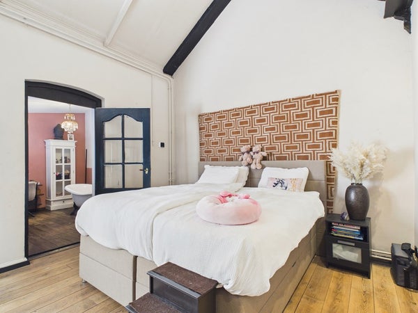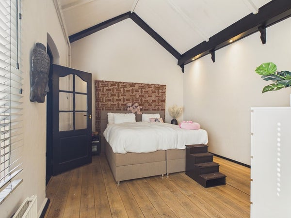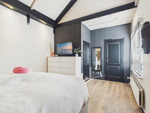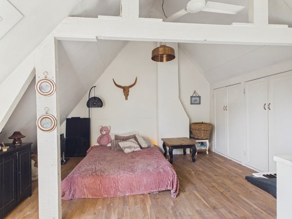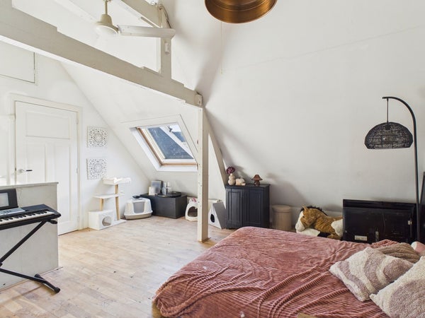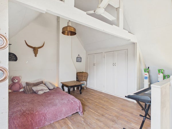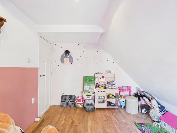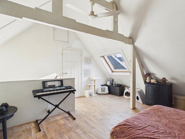 Vanuit de overloop van de eerste verdieping heeft u toegang tot twee slaapkamers. De overloop dient op dit moment als speelkamer maar kan ook als slaapkamer gerealiseerd worden. Deze kamer beschikt over een vaste kastenwand, radiator en velux dakraam. Het plafond is voorzien van gips en is gesausd. De wanden zijn voorzien van stucwerk en zijn gesausd. De vloer is voorzien van hout, parket en een eiken houten vloer (white wash olie).
