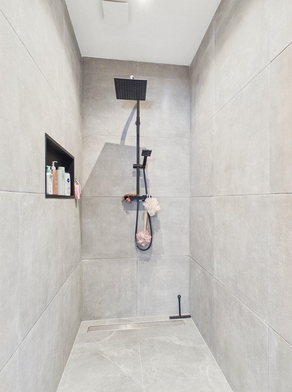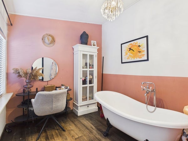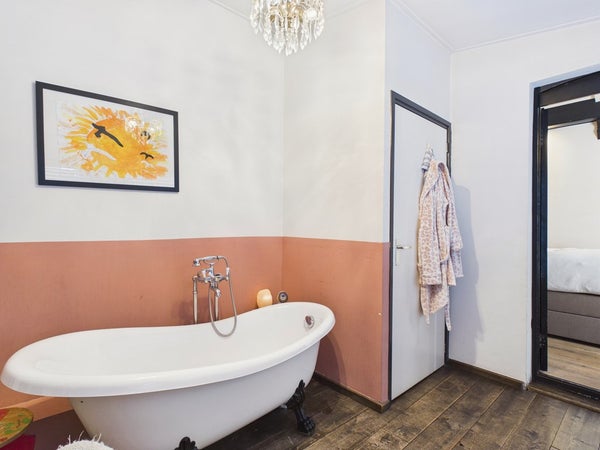 De badkamer beschikt over een ligbad met thermostaatkraan, radiator en een vaste kast. Het plafond is voorzien van gips, stucwerk en is gesausd. De wanden zijn voorzien van stucwerk en zijn gesausd. De vloer is voorzien van beton, eiken houten vloer.