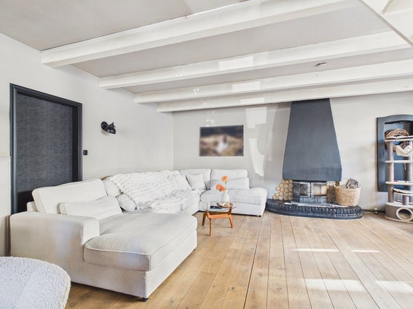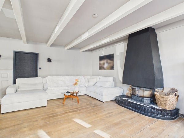 De ruime en sfeervolle L-vormige woonkamer beschikt over een schouwpartij met houtkachel en dubbelwandige pijp, radiator, telefoon- en kabelaansluiting en dubbel glas. Deze woonkamer biedt voldoende ruimte voor het creëren van een ruime zit- en eethoek. Het plafond is voorzien van gips met balken en is gesausd. De wanden zijn voorzien van lambrisering, stucwerk en is gesausd. De vloer is voorzien van beton, massief eiken vloer. Vanuit de woonkamer heeft u toegang tot de keuken.