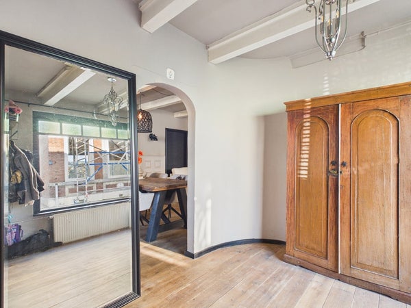 U komt de woning binnen via de ruime hal. De hal beschikt over de meterkast, radiator, dubbel glas en de garderobekast. Sfeer ontmoet u gelijk in de hal doordat er authentieke tegeltjes aanwezig zijn. De meterkast beschikt over 4 groepen, dubbeltariefmeter, kabelaansluiting, 1 krachtgroep en aardlek. De gas- en watermeter bevinden zich in de kast. Het plafond is voorzien van gips met balken en is gesausd. De wanden zijn voorzien van stucwerk en de vloer is voorzien van beton, houten eiken vloer. Vanuit de entree heeft u toegang tot de woonkamer.