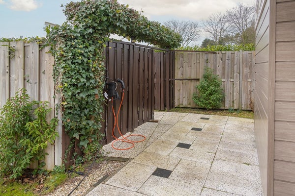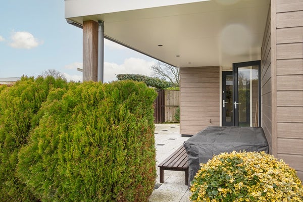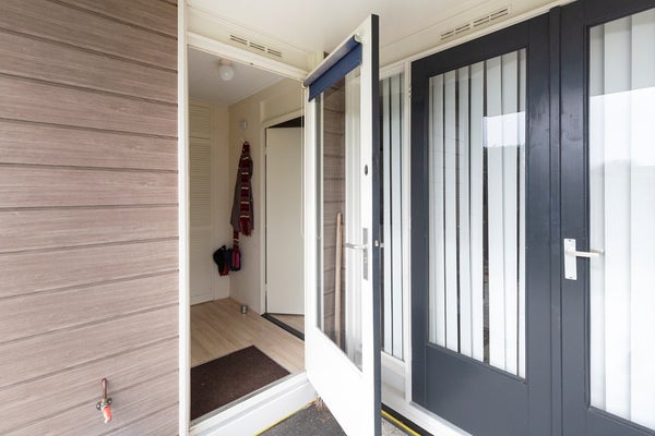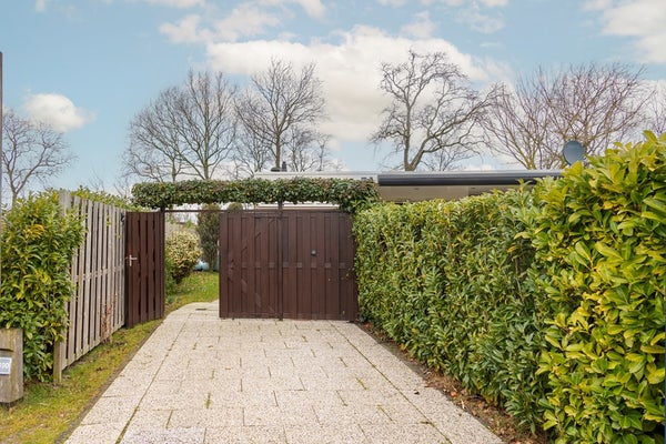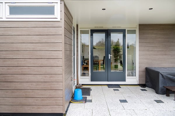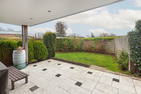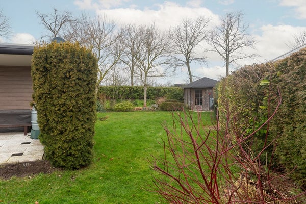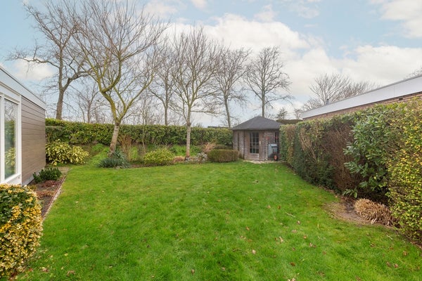 Via de openslaande deuren stapt u op het zonneterras, op het zuiden gericht. Dit zonneterras is voorzien van een groot elektrisch aangedreven zonnescherm. Door de situering op de kavel is er rondom de woning eigenlijk op ieder moment van de dag een zonnnige plek te vinden. De tuin is verzorgd en vooral voorzien van gazon. De inpandige berging is buitenom te bereiken, hier zijn de witgoedaansluitingen gesitueerd en is voldoende ruimte voor het stallen van uw fietsen. In de hoek van het perceel staat een vrijstaande, houten tuinberging.