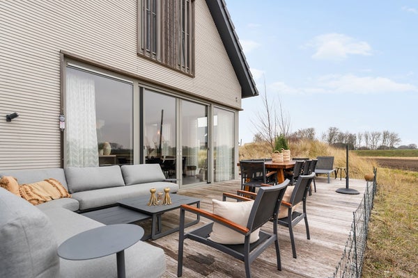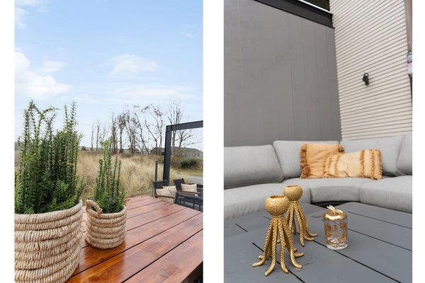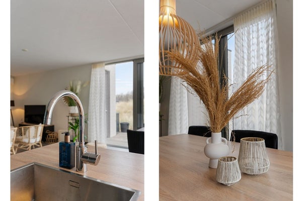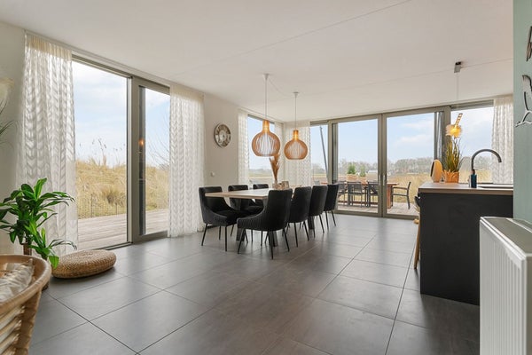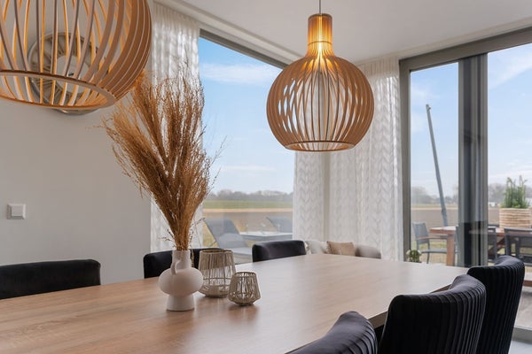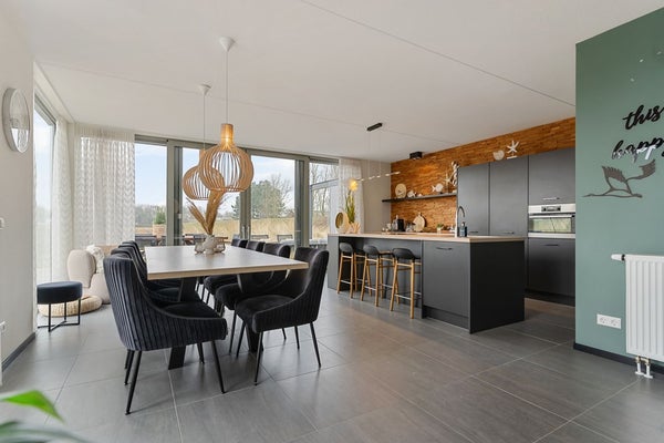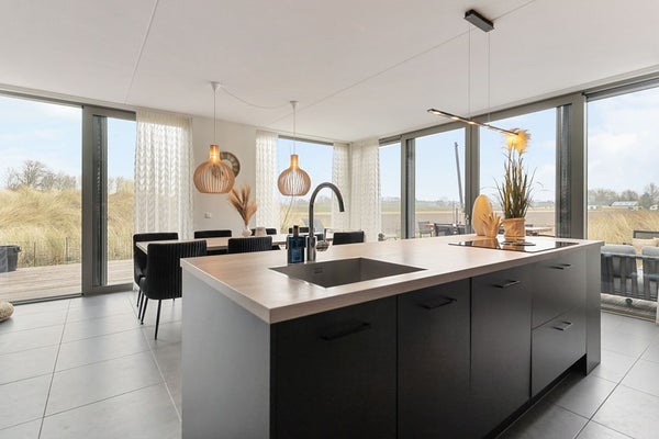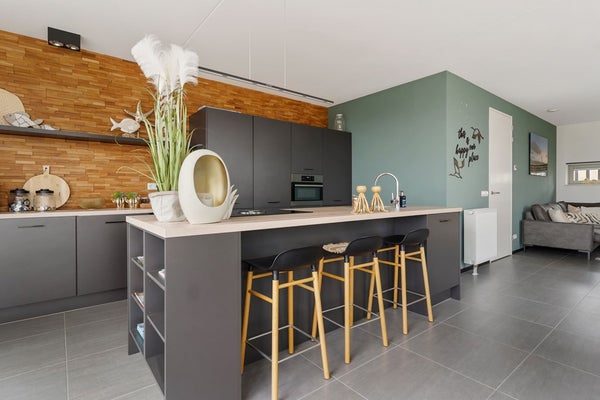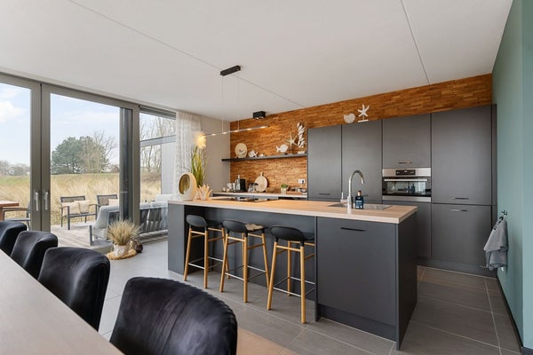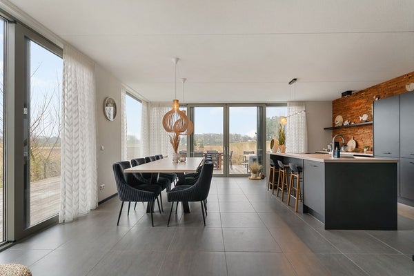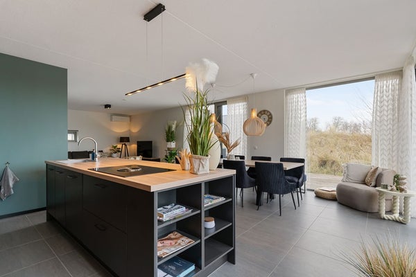 Via de entree, met toiletruimte voorzien van een hangcloset met bidet en fonteintje, de meterkast en technische ruimte, betreedt u de lichte woonkamer. Grote raampartijen zorgen voor veel natuurlijk daglicht en een fraai vrij uitzicht over het landschap. De openslaande deuren verbinden binnen en buiten op een natuurlijke manier. De woonkamer staat in open verbinding met de moderne keuken, die luxe is uitgevoerd met diverse inbouwapparatuur, praktische opbergruimte en een kookeiland. De gehele woning is voorzien van comfortabele vloerverwarming. Daarnaast beschikt de woonkamer over een airconditioner.