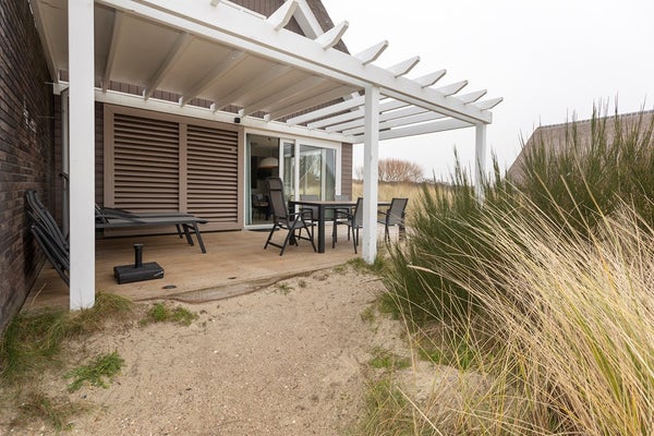 De duinen rondom de woning zijn begroeid met helmgras. Hierdoor ervaart u op het vlonderterras, waar u de gehele dag zon heeft, veel privacy. De inpandige berging, buitenom te bereiken, is voorzien van elektra en water. Hier bevinden zich de cv-ketel en de witgoedaansluitingen. Het strand bereikt u binnen enkele minuten lopen!