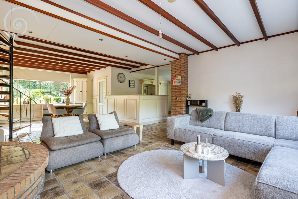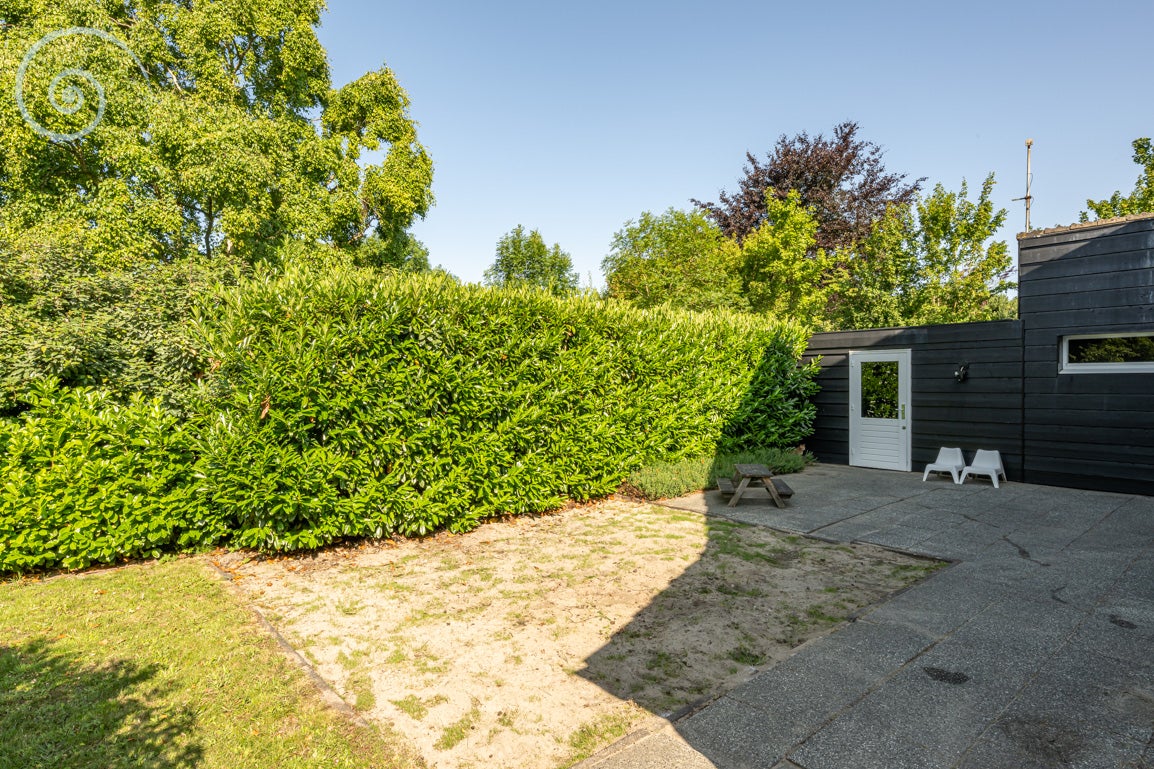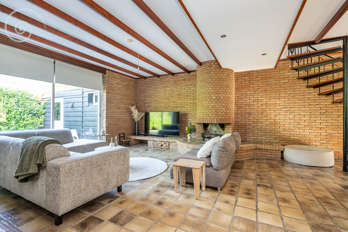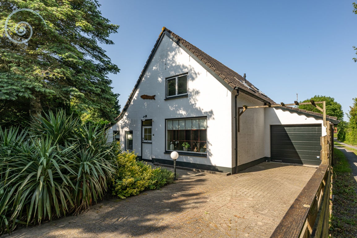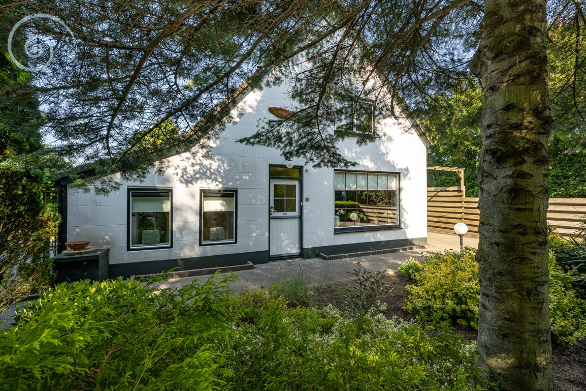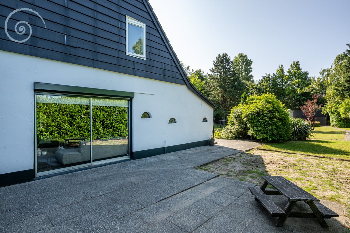 De tuin rondom biedt rust en privacy, met meerdere terrassen en een berging/garage voor voertuigen. De woning heeft een woonoppervlakte van 138 m² en dateert uit 1955.