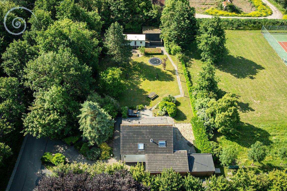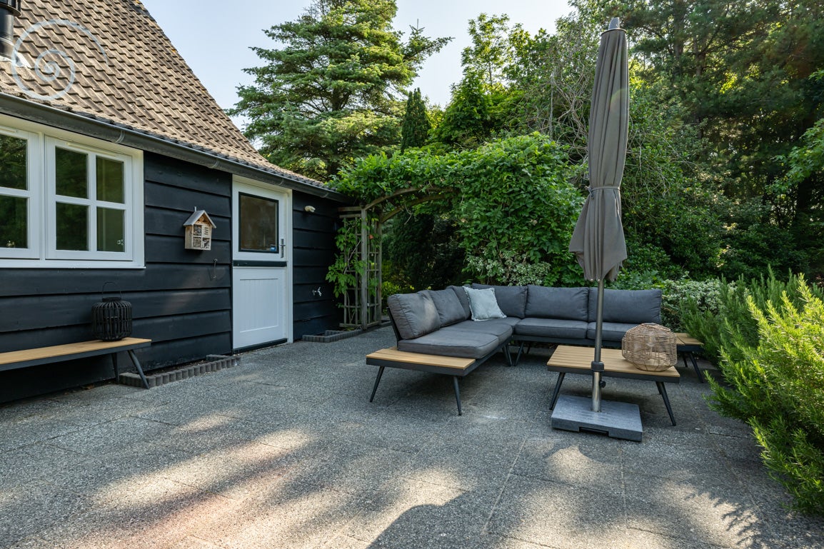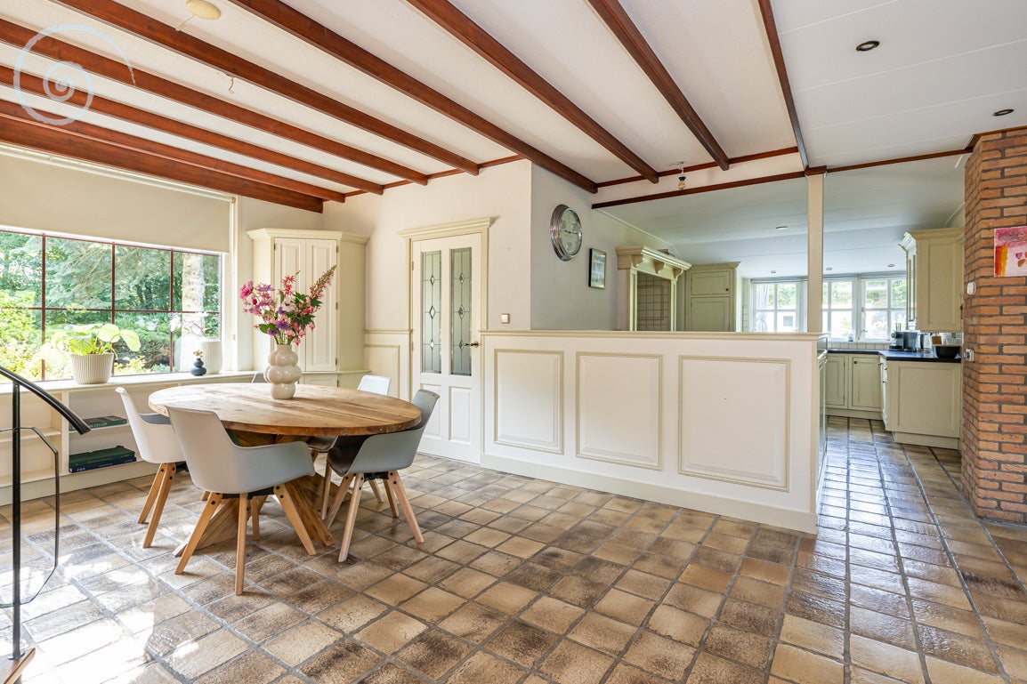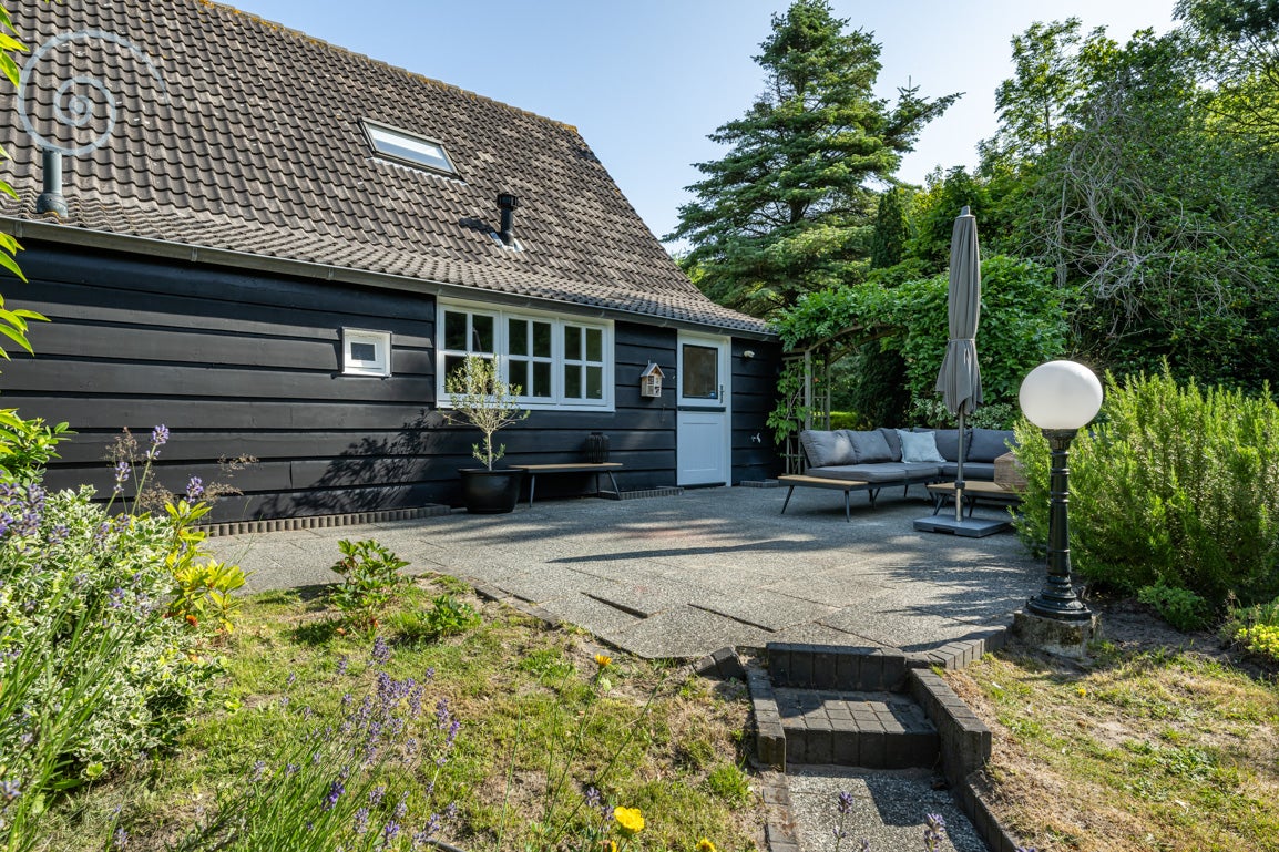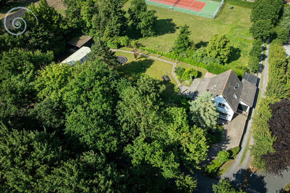 De tuin rondom biedt rust en privacy, met meerdere terrassen en een berging/garage voor voertuigen. De woning heeft een woonoppervlakte van 138 m² en dateert uit 1955.