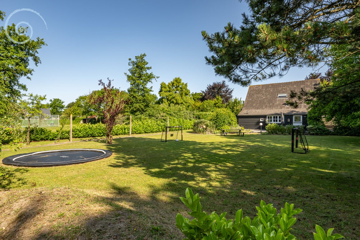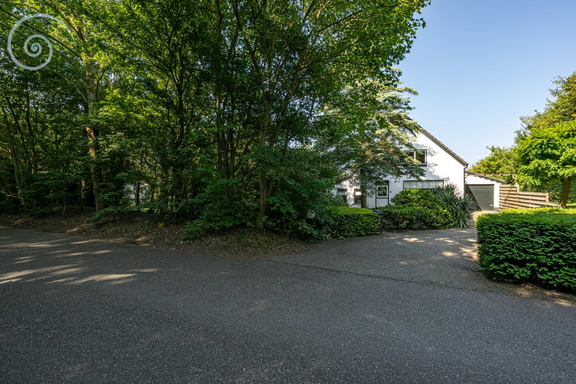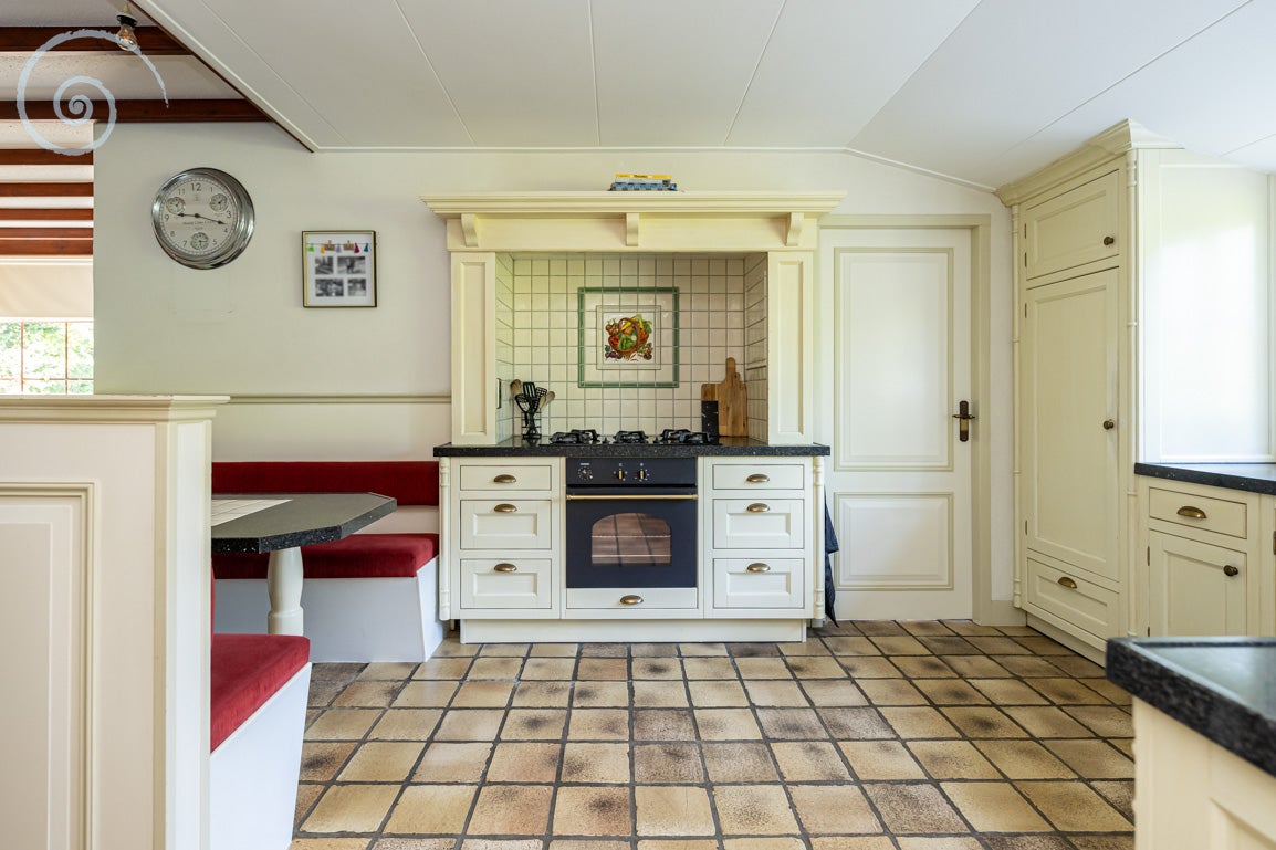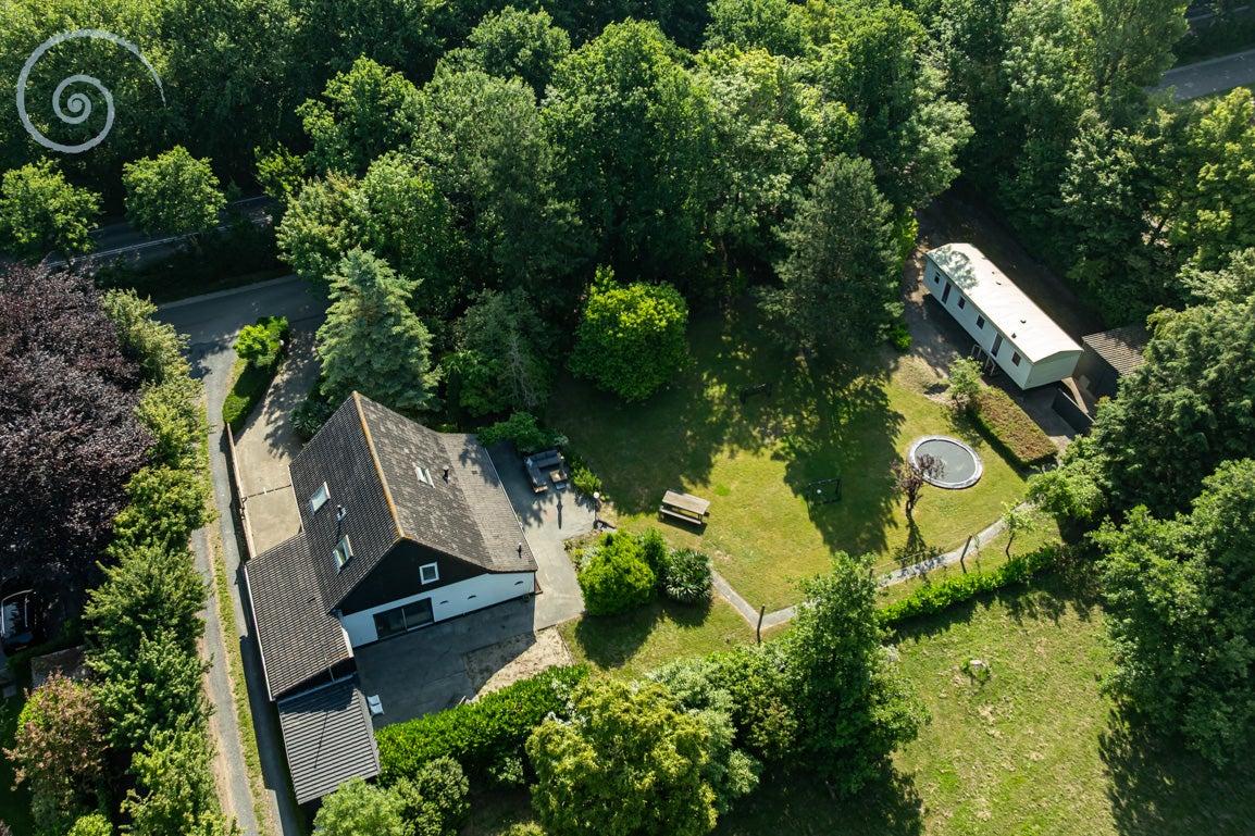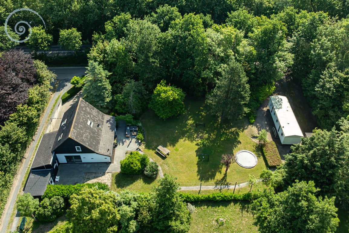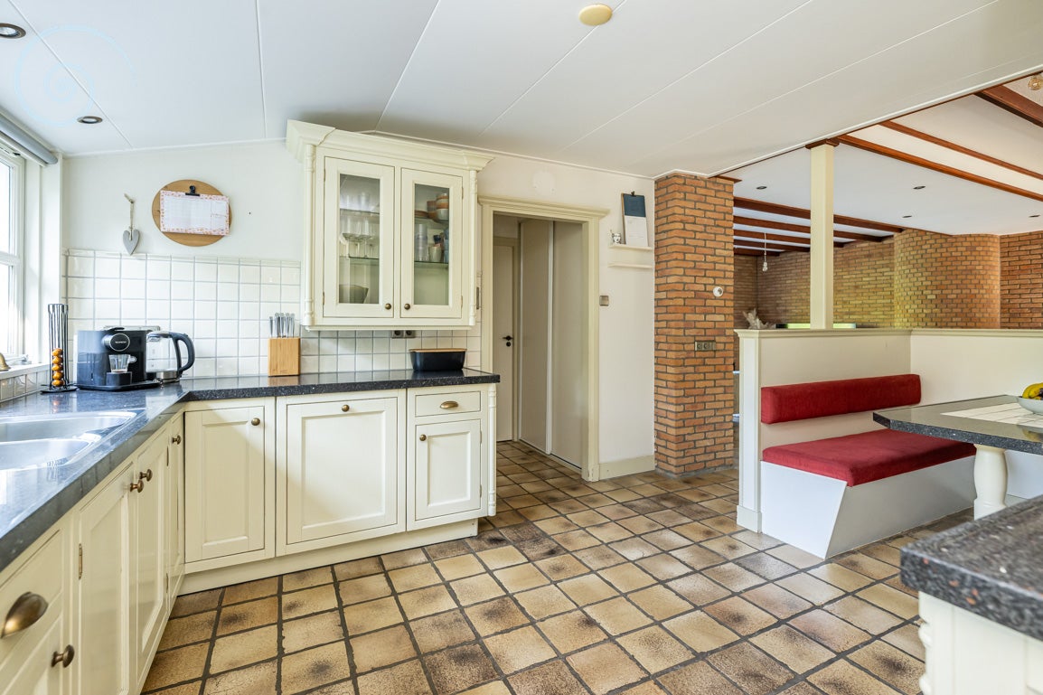 De tuin rondom biedt rust en privacy, met meerdere terrassen en een berging/garage voor voertuigen. De woning heeft een woonoppervlakte van 138 m² en dateert uit 1955.