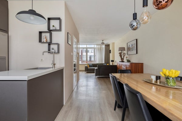 Op de eerste verdieping bevindt zich de lichte en ruime woonkamer met grote raampartijen en toegang tot het balkon. De open keuken (vernieuwd in 2020) is modern uitgevoerd en voorzien van diverse inbouwapparatuur. Ook heeft deze verdieping een separaat toilet.