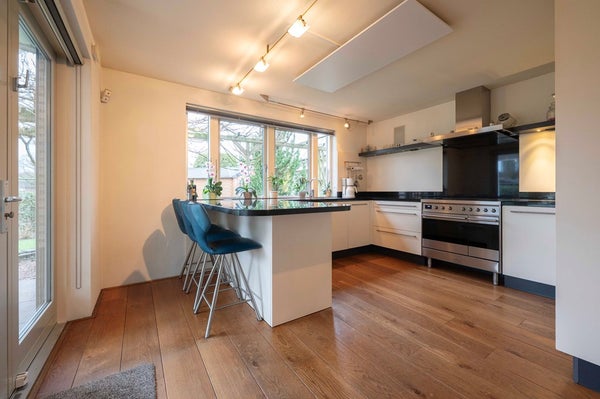 Aan de achterzijde van de woning bevindt zich de moderne, open keuken: strak ingericht, van alle gemakken voorzien en klaar voor culinaire hoogstandjes. Wat deze keuken bijzonder maakt, zijn de openslaande tuindeuren. Even de deur openzetten en je loopt zo de fraaie tuin in – ideaal tijdens zomerse dagen, barbecues of gewoon om in de ochtend genietend wakker te worden met koffie in de buitenlucht. Ook qua contact met de tuin is dit huis dus één groot plezier.