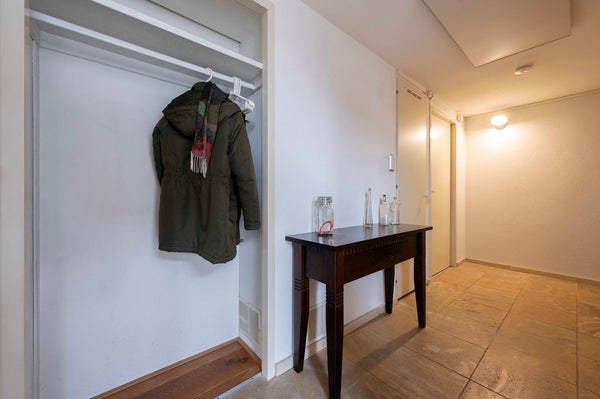 Stap binnen in de hal, waar je naast het toilet en de trapopgang, ook een handige voorraadkast vindt.