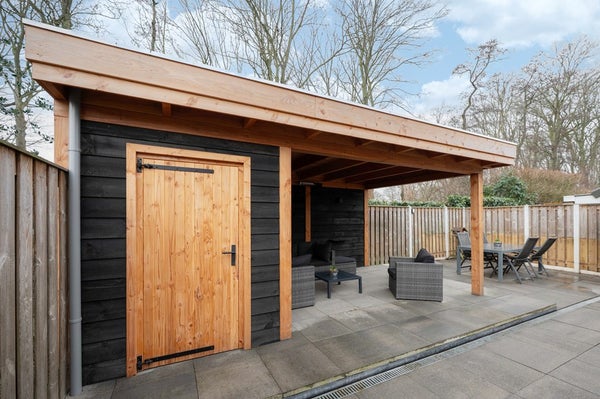 Achter het huis ligt de volledig betegelde achtertuin, zodat je nauwelijks omkijken hebt naar het onderhoud. De trendy overkapping maakt het tot een heerlijke extra buitenkamer, perfect geschikt om vrienden te ontvangen of gewoon lekker relaxt te genieten van het leven.