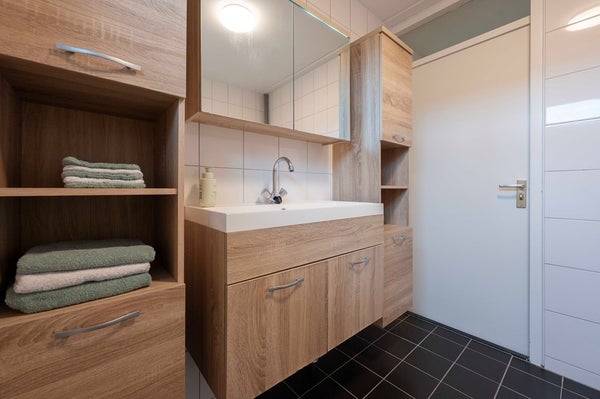 Op de eerste verdieping zijn drie volwaardige slaapkamers aanwezig. De badkamer is modern betegeld en slim ingedeeld: een ligbad met douchescherm, tweede toilet en een eigentijds wastafelmeubel bieden alles wat je wenst.