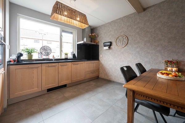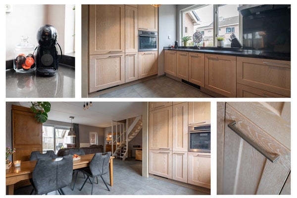 Aan de voorzijde vind je de open keuken, uitgevoerd met een massief eiken keukeninrichting en moderne inbouwapparatuur. Hier kun je lekker kokkerellen terwijl je in contact blijft met je gezin of je gasten. Praktisch, robuust en sfeervol: aan alles is gedacht.