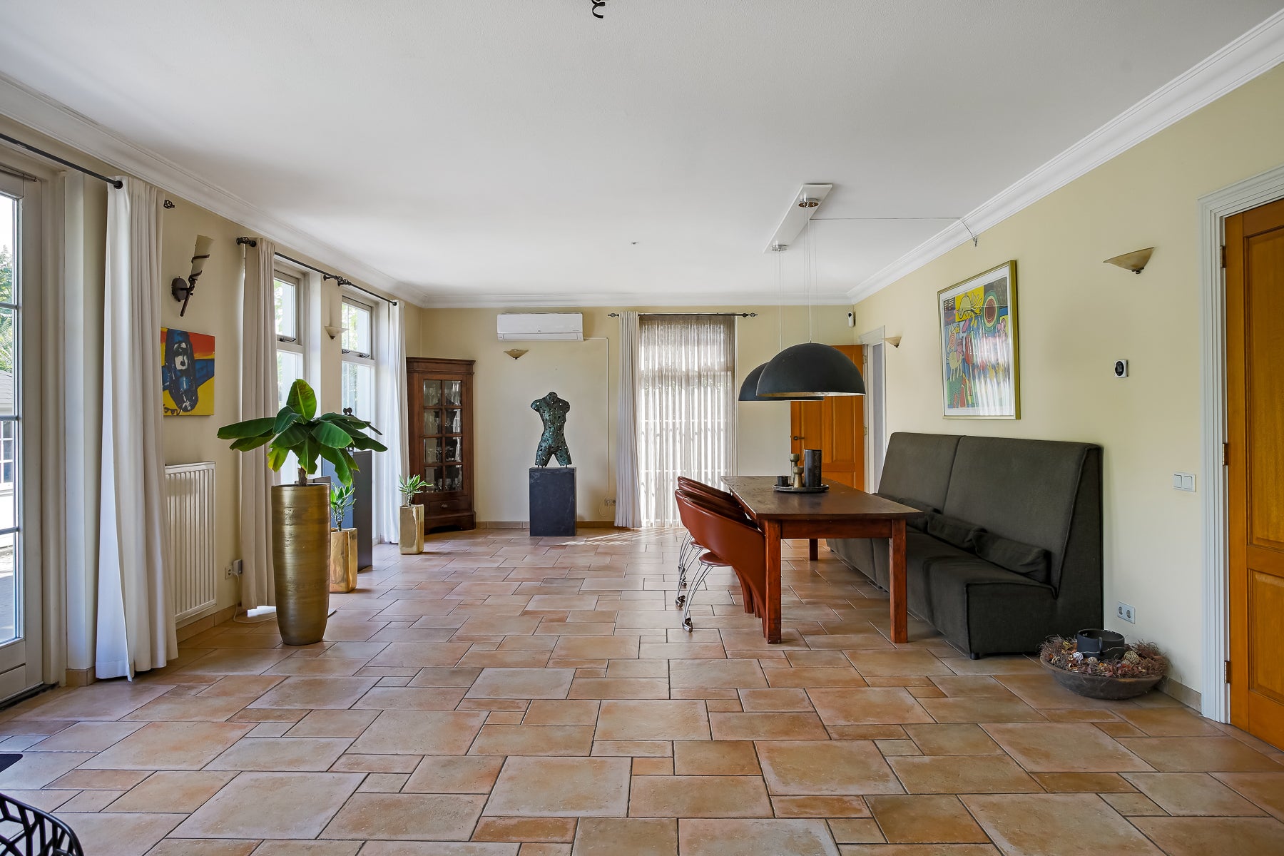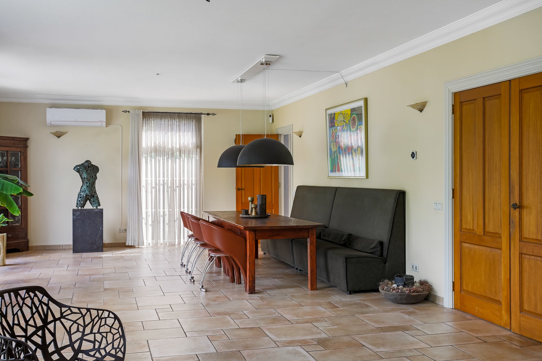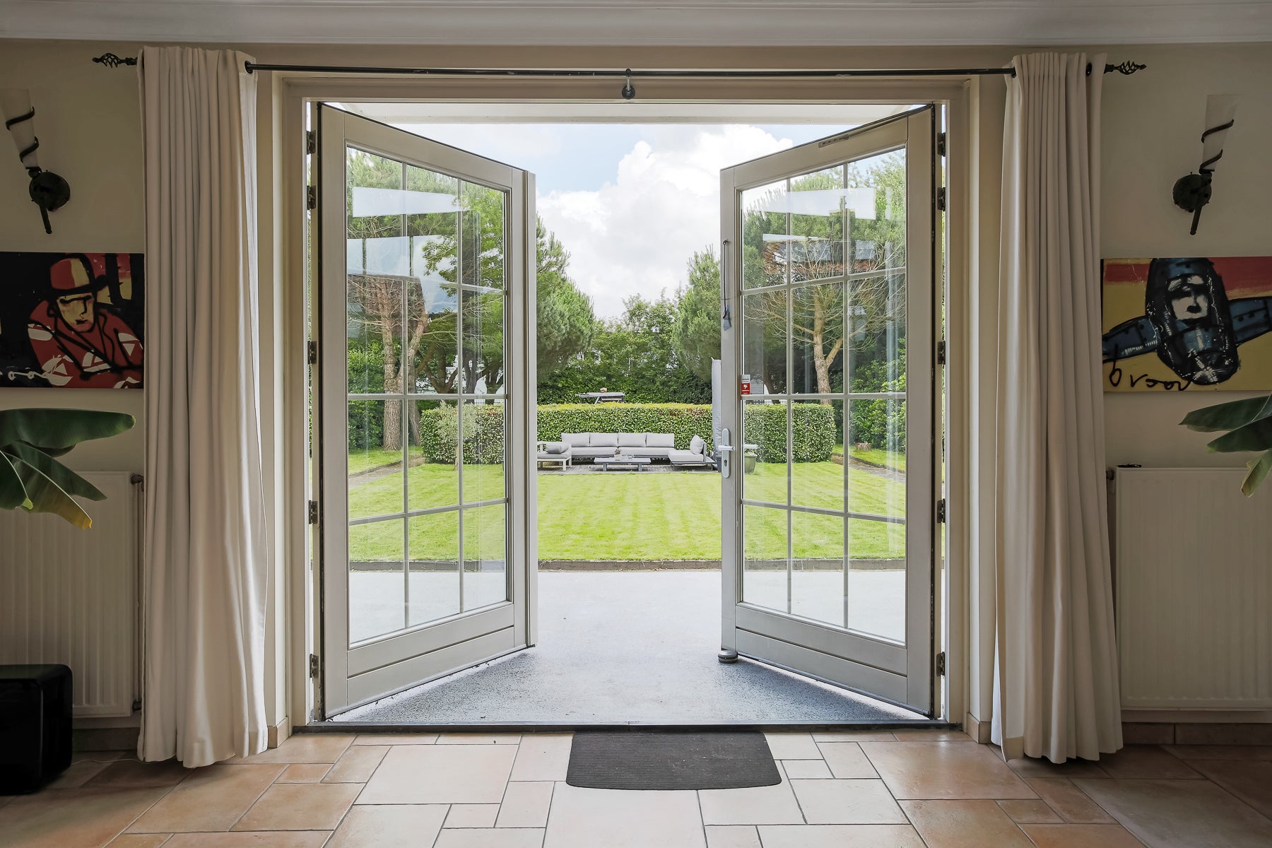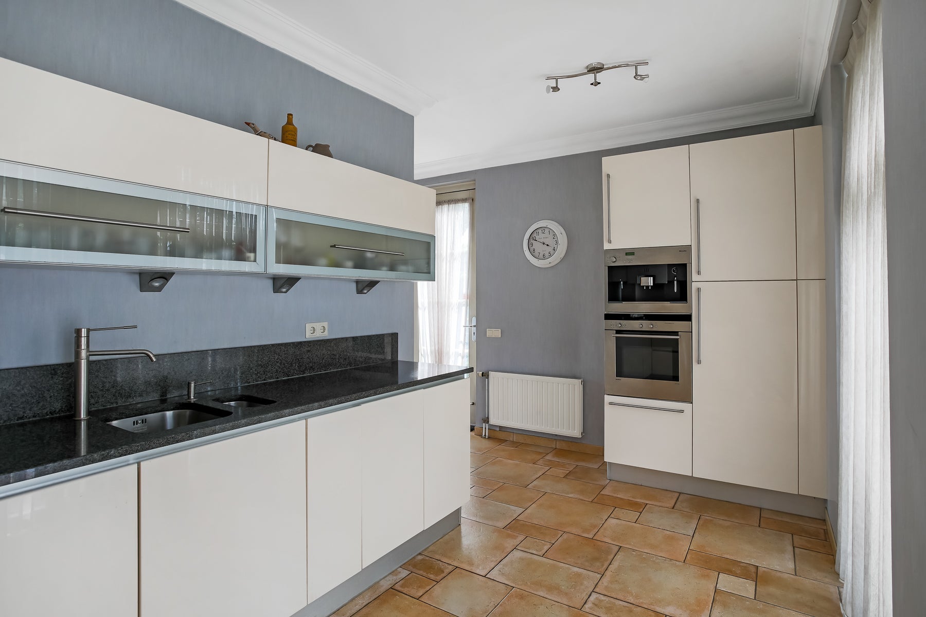 De imposante hal met vide leidt naar de lichte L-vormige woonkamer, waar openslaande deuren toegang geven tot de tuin. De halfopen keuken met Italiaans design sluit aan op het eetgedeelte, ideaal voor diners met familie en vrienden. Op de verdieping bevinden zich de master bedroom met balkon en vier andere ruime slaapkamers. Twee badkamers zijn beschikbaar, één met een ligbad en de ander met een douche. Buiten geniet je van een grote tuin met terrassen en privacy. Deze woning, gebouwd in 2002, is ideaal voor een groot gezin.