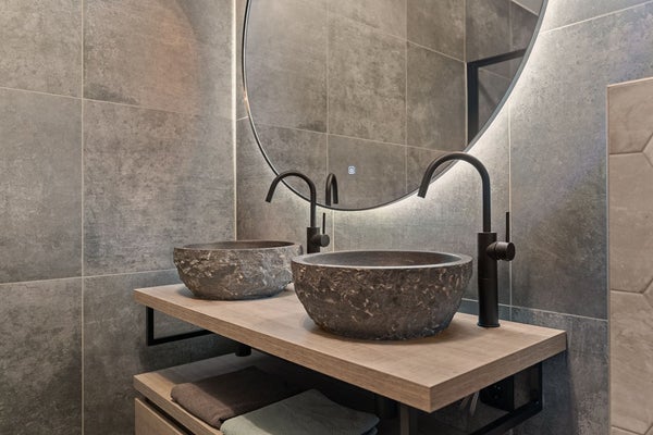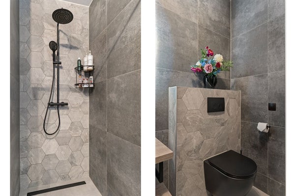 Tussen beide kamers in bevindt zich de badkamer. Deze beschikt over een ruime inloopdouche met dubbele wastafel, designradiator en toilet.