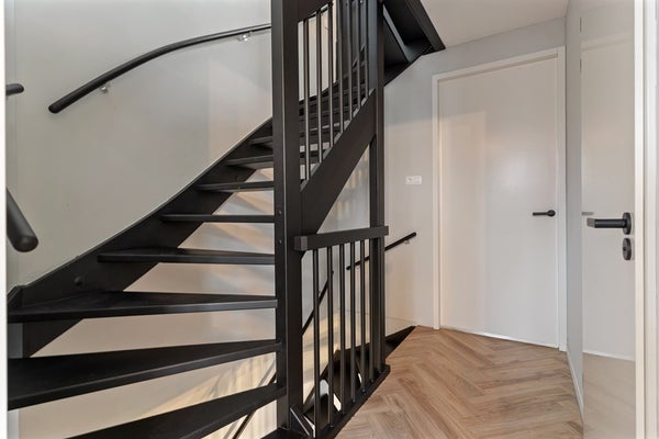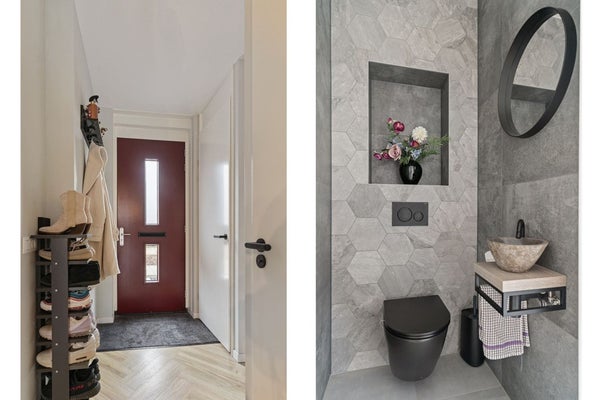 Middels de voortuin kom je aan in de ruime hal, waar je meteen de luxe van deze woning kunt ervaren. Hier bevindt zich het toilet met fonteintje, volledig in zelfde style als de badkamer. Ook bevinden zich hier de meterkast en de warmtepomp installatie.