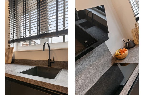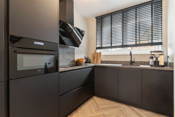 Via de hal, voorzien van een prachtige stalen deur, loop je door naar de woonkamer. De woonkamer geeft een ruim gevoel door de enorme schuifpui en de ruimte is volledig naar wens in te delen. De half open keuken is voorzien van hoogwaardige inbouwapparatuur; wasbak, inductiekookplaat met afzuiging, vaatwasser, combi-oven en koel-/vriescombinatie (allen van AEG).