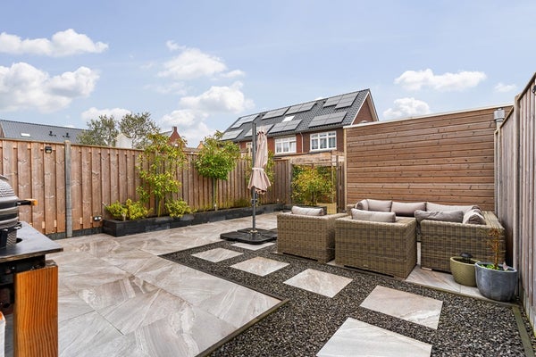 In tuin gelegen op het westen kun je heerlijk genieten van het zonnetje en de schuur geeft mogelijkheid tot extra opbergruimte. De achtertuin (circa 80m2) is zowel via de zijpoort als via de achterpoort bereikbaar.