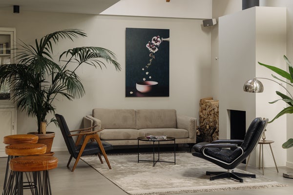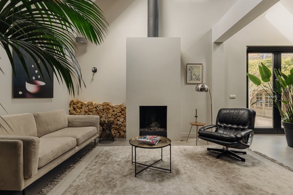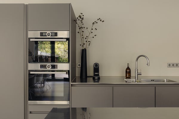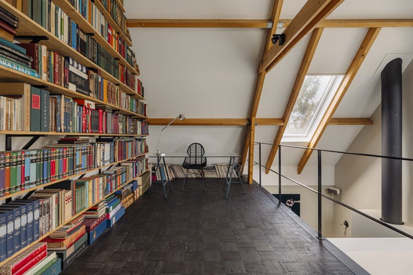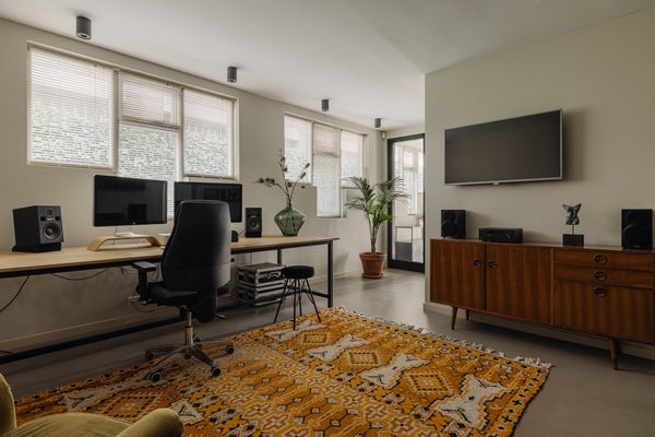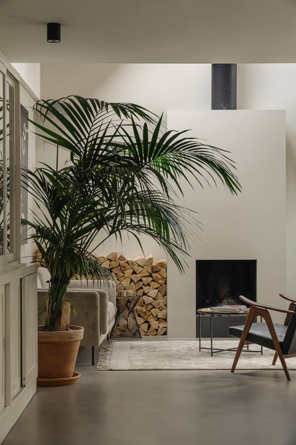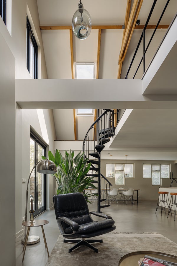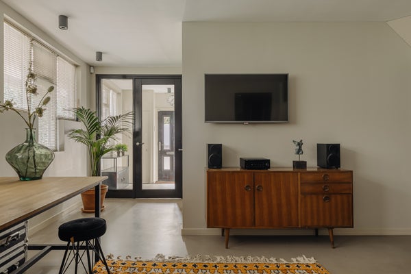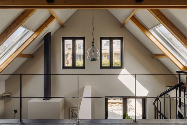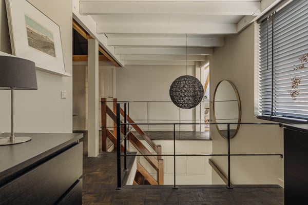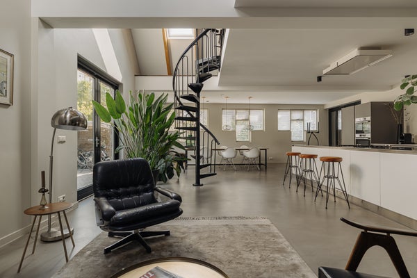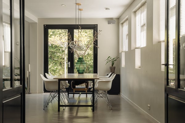 You enter the home via the side entrance into a spacious hallway providing access to all rooms. At the rear of the house is the bright and open living and dining area with fireplace, black wooden steel-look glass doors and a stylish open kitchen. The kitchen forms the heart of this space and is equipped with a designer cooking island by Arclinea with a four-burner gas hob, a stainless steel worktop of over four metres, dishwasher, large fridge-freezer combination, Quooker, oven and steam oven. Adjacent to the kitchen is a cozy TV room, accessible through black wooden glass doors. From the living room there are two sets of French doors opening onto the sunny garden. A spiral staircase in the living room leads to the open mezzanine, currently arranged as a workspace and library. The height and openness give the entire space a loft-like feel.
