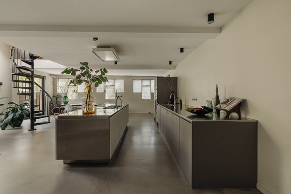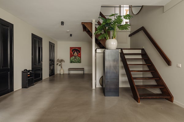 The entire ground floor is finished with a coloured sand cement floor with an epoxy top layer and is fully equipped with underfloor heating.