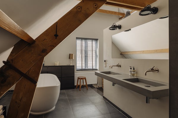 The first floor is accessed via an open wooden staircase in the hallway. This level offers four spacious bedrooms. The landing is wide, high and impressive due to the exposed wooden beam structure. At the rear are two generous bedrooms, with a third bedroom located on the side of the house. At the front is the large master bedroom with a walk-in wardrobe and a luxurious en suite bathroom. This bathroom features a walk-in shower, double washbasin, freestanding bathtub and ample natural daylight from two large windows. This floor also includes a second bathroom with walk-in shower, washbasin unit and storage cabinet, as well as a separate toilet. The entire floor is finished with wooden flooring.